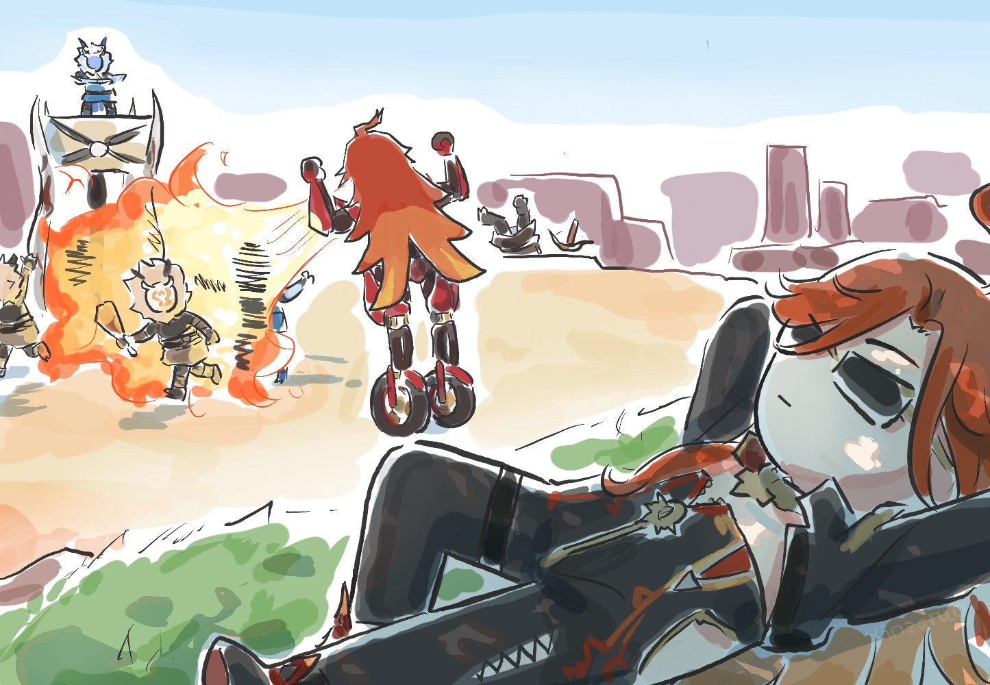 1girl arms_behind_head black_bodysuit black_jacket blonde_hair bodysuit chibi commentary day fire flamestrider_(genshin_impact) genshin_impact hilichurl_(genshin_impact) jacket long_hair lying mavuika_(genshin_impact) multiple_boys on_back open_clothes open_jacket orange_hair outdoors solo_focus sunglasses untranslatable_commentary xinzoruo