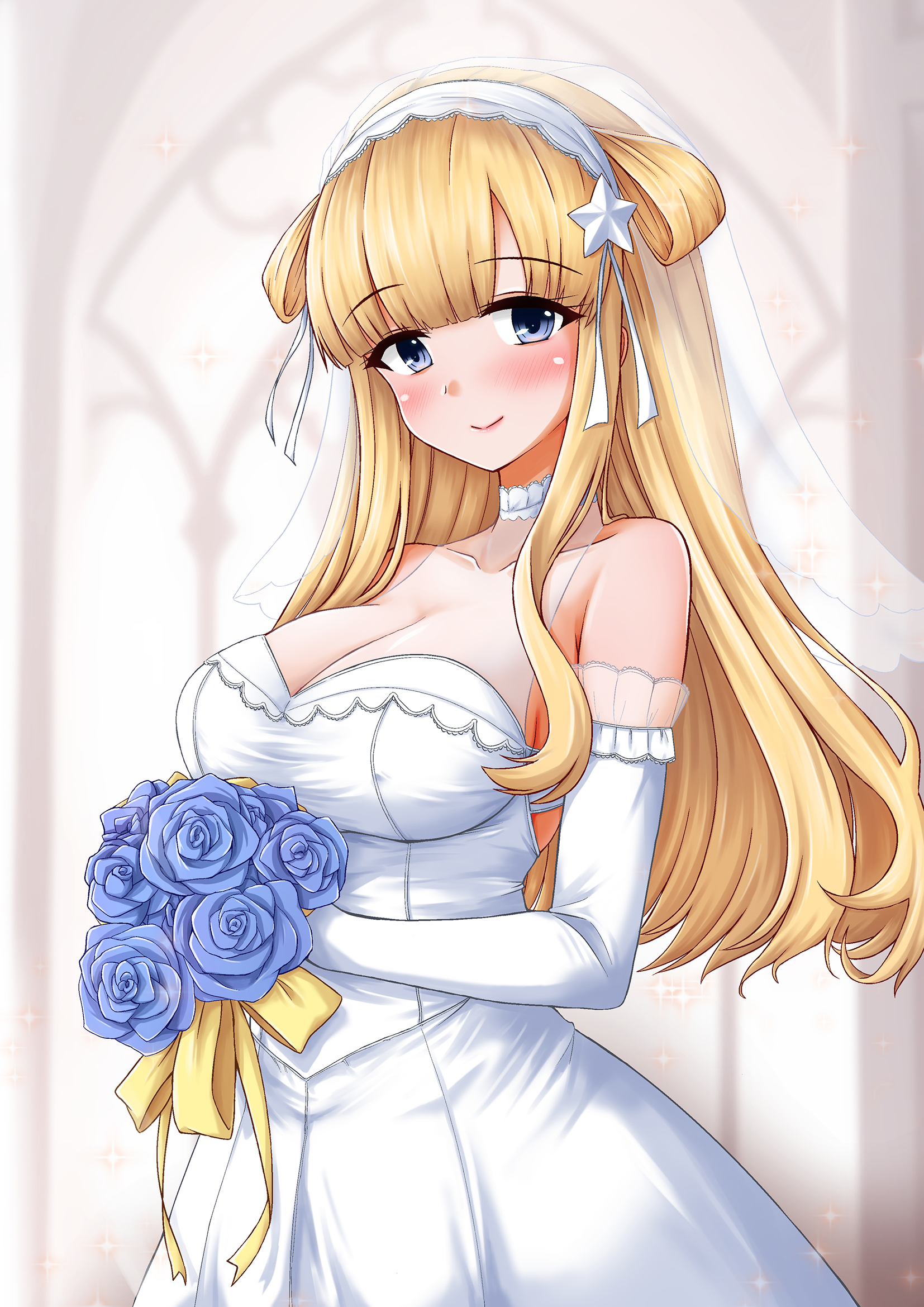 1girl blonde_hair blue_eyes blue_flower blue_rose bouquet breasts bridal_veil bride double_bun dress elbow_gloves fletcher_(kancolle) flower gloves hair_bun hair_ornament highres holding holding_bouquet kamiya_tadato kantai_collection large_breasts long_hair looking_at_viewer rose sleeveless sleeveless_dress smile solo star_(symbol) star_hair_ornament veil wedding_dress white_dress white_gloves