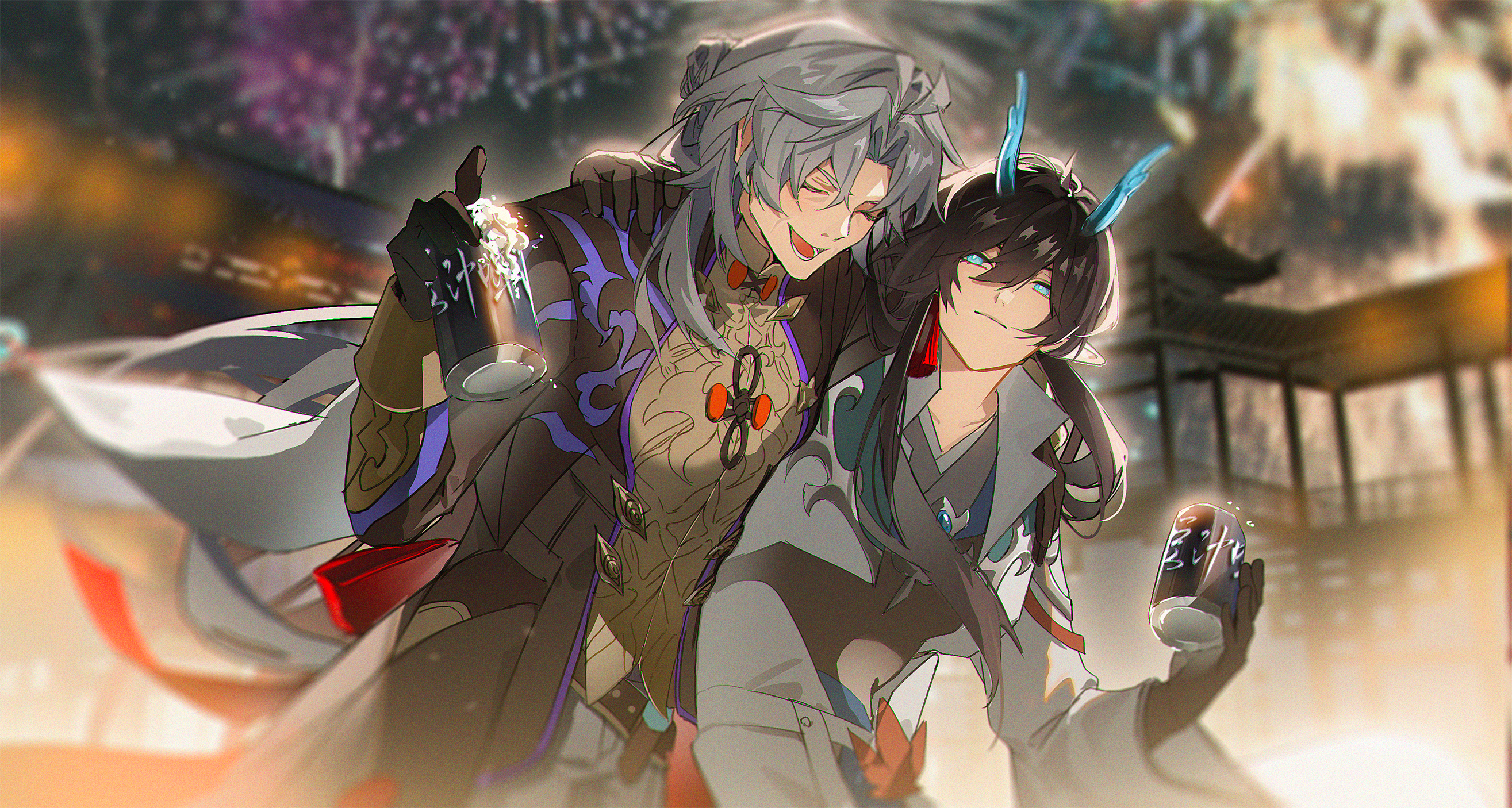 &{ID:11878314 CreatedAt:Sun May 04 13:00:31 -0500 2025 Score:1 Width:2630 Height:1406 MD5:ef285f2cc62cfdec98a07cd00db8d116 Directory:ef/28 Image:ef285f2cc62cfdec98a07cd00db8d116.png Rating:general Source:https://www.pixiv.net/artworks/126821525 Change:1758386737 Owner:danbooru CreatorID:6498 ParentID:0 Sample:1 PreviewHeight:187 PreviewWidth:350 Tags:2boys ahoge architecture belt black_gloves black_hair black_jacket blade_(honkai:_star_rail) blue_eyes blue_horns blurry blurry_background can chinese_clothes closed_eyes coat collared_coat commentary_request dan_feng_(honkai:_star_rail) dan_heng_(honkai:_star_rail) dan_heng_(imbibitor_lunae)_(honkai:_star_rail) dragon_horns east_asian_architecture eastern_dragon_horns expressionless fireworks floating_clothes foam folded_ponytail gloves grey_hair hair_between_eyes hanaki0504 hands_on_another's_shoulders highres holding holding_can honkai:_star_rail honkai_(series) horns jacket jewelry long_hair long_sleeves looking_at_another male_focus multiple_boys night open_clothes open_coat open_mouth outdoors parted_bangs pointy_ears smile upper_body white_coat wide_sleeves yingxing_(honkai:_star_rail) Title: HasNotes:false HasComments:false FileURL:https://img2.gelbooru.com/images/ef/28/ef285f2cc62cfdec98a07cd00db8d116.png PreviewURL:https://gelbooru.com/thumbnails/ef/28/thumbnail_ef285f2cc62cfdec98a07cd00db8d116.jpg SampleURL:https://img2.gelbooru.com/samples/ef/28/sample_ef285f2cc62cfdec98a07cd00db8d116.jpg SampleHeight:454 SampleWidth:850 Status:active PostLocked:0 HasChildren:false IsVideo:false DisplayDate:04.05.2025 13:00}