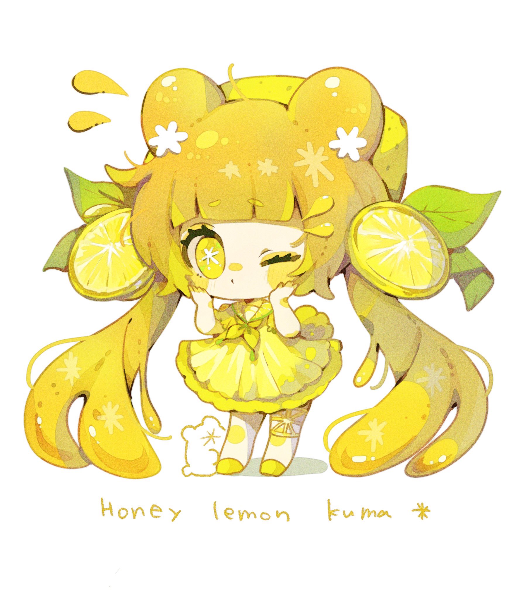 1girl absurdly_long_hair bear blonde_hair blunt_bangs blush_stickers bright_pupils chibi chibi_only creature double_bun dress flying_sweatdrops food food-themed_hair_ornament fruit full_body hair_bun hair_ornament hands_on_own_cheeks hands_on_own_face hands_up highres leaf_hair_ornament lemon lemon_hair_ornament lemon_slice liquid_hair long_hair looking_at_viewer low_twintails neckerchief no_sclera one_eye_closed original romaji_text sailor_collar shoes simple_background solo standing symbol-shaped_pupils tabasukokororin thighhighs twintails very_long_hair white_background white_pupils yellow_dress yellow_eyes yellow_neckerchief yellow_sailor_collar yellow_shoes