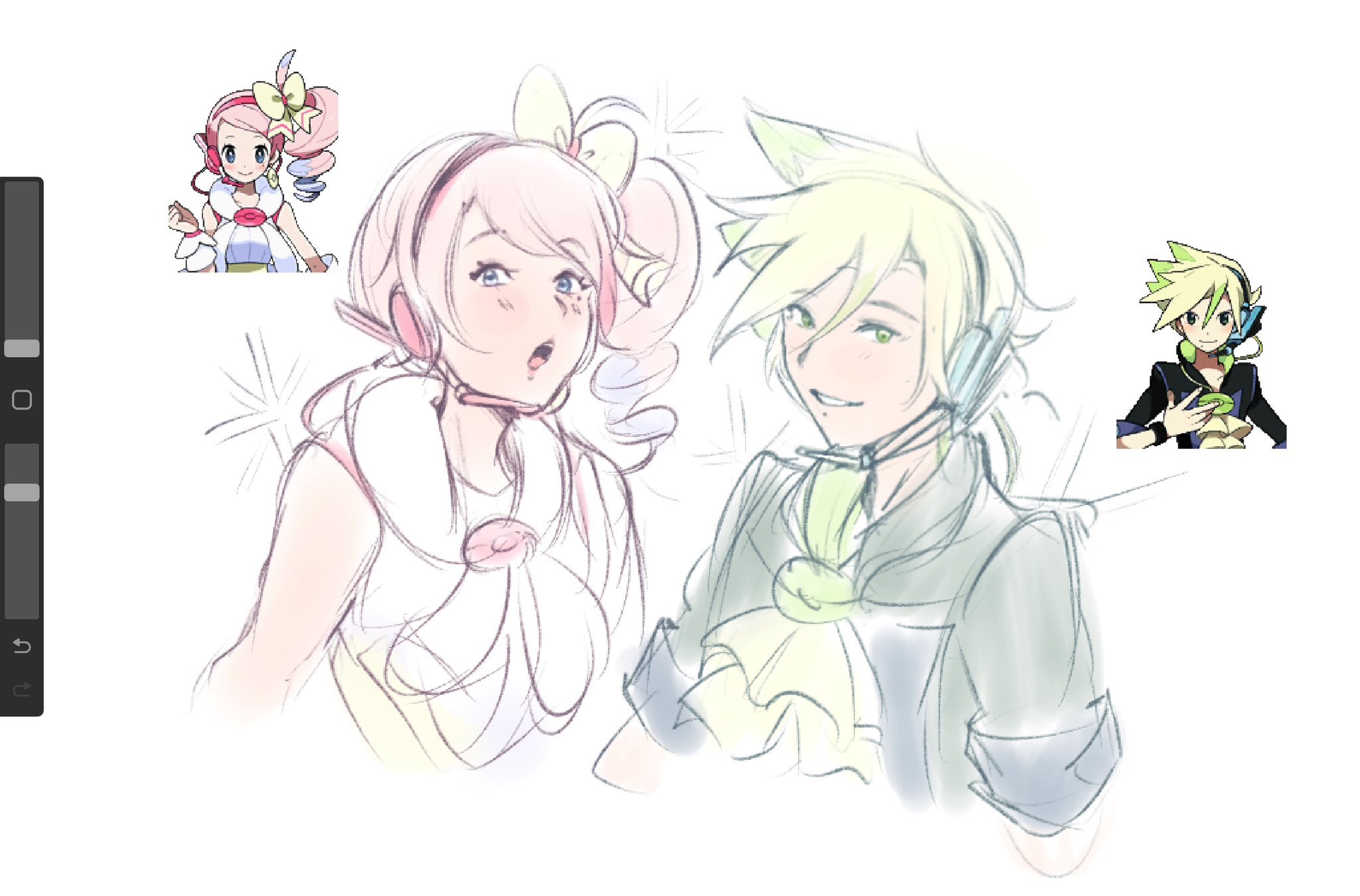 1boy 1girl art_program_in_frame ascot blue_eyes curtis_(pokemon) earpiece green_ascot green_eyes green_hair highres looking_at_viewer mole mole_under_mouth nintendo open_mouth pink_hair pokemon pokemon_bw2 reference_inset side_ponytail yancy_(pokemon) yoshiiano