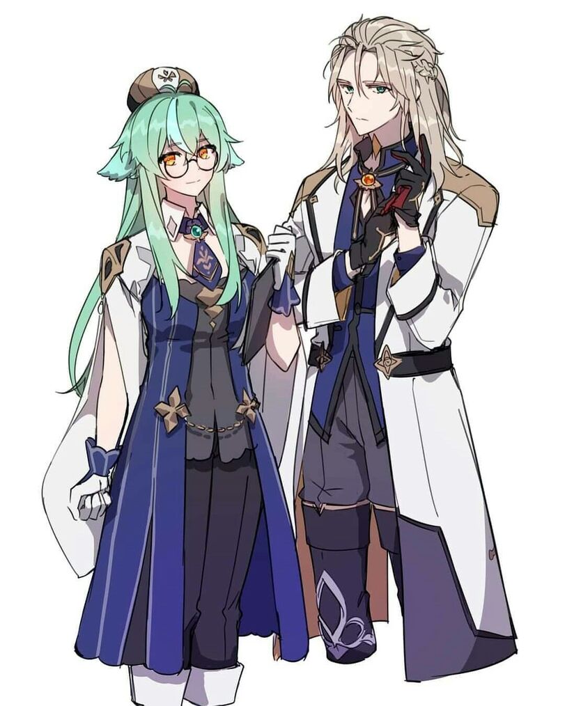 1boy 1girl aged_up albedo_(genshin_impact) alternate_costume animal_ears bad_id bad_twitter_id black_gloves black_pants blonde_hair blue_dress blue_eyes blue_shirt coat dress fox_ears genshin_impact glasses gloves green_hair grey_pants hat highsugarshork long_hair looking_at_viewer orange_eyes pants round_eyewear shirt shrug_(clothing) simple_background sucrose_(genshin_impact) white_background white_coat white_gloves white_shrug