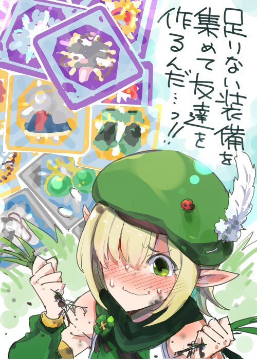 1girl aoi_(princess_connect!) bare_shoulders beret blonde_hair blush bug commentary_request detached_sleeves elf gameplay_mechanics green_eyes green_hat hair_over_one_eye hat holding insect ito_ryo ladybug nose_blush one_eye_covered pointy_ears princess_connect! raised_inner_eyebrows short_hair sidelocks sleeveless solo translation_request weeds