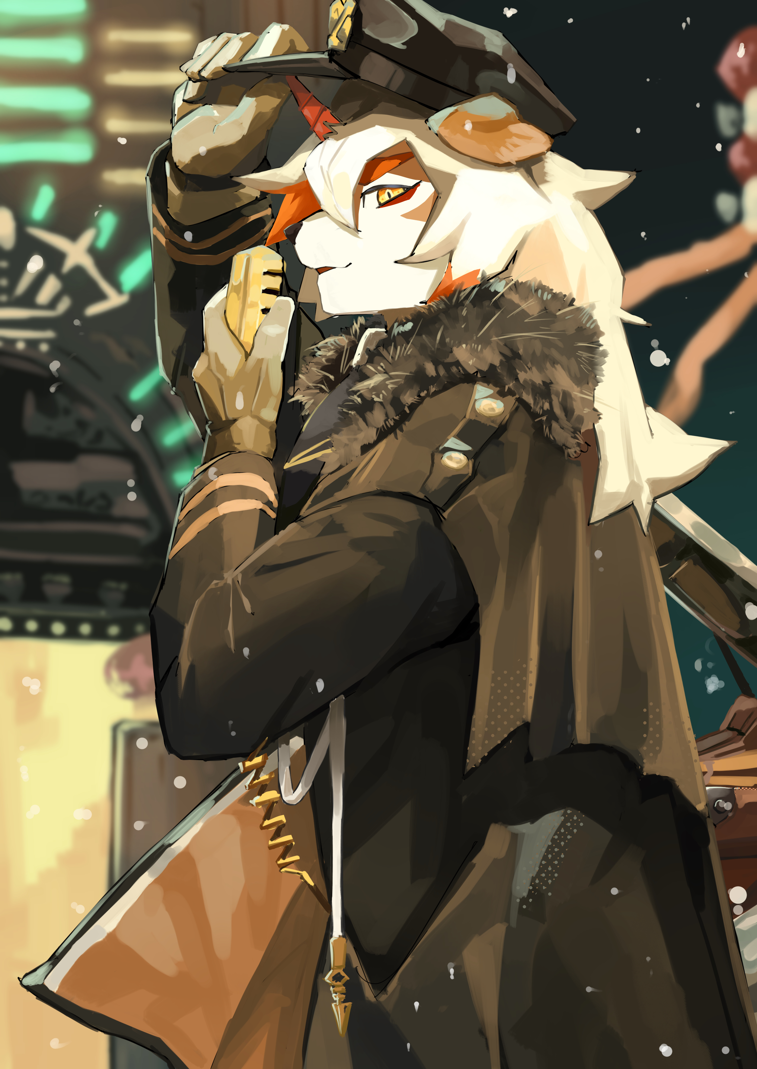 1boy absurdres arknights black_coat blonde_hair body_fur coat commentary_request cowboy_shot dog_boy furry furry_male gloves grey_gloves hat highres horns hung_(arknights) hung_(just_a_driver)_(arknights) long_hair looking_at_viewer male_focus nakan outdoors peaked_cap single_horn snow solo standing yellow_eyes