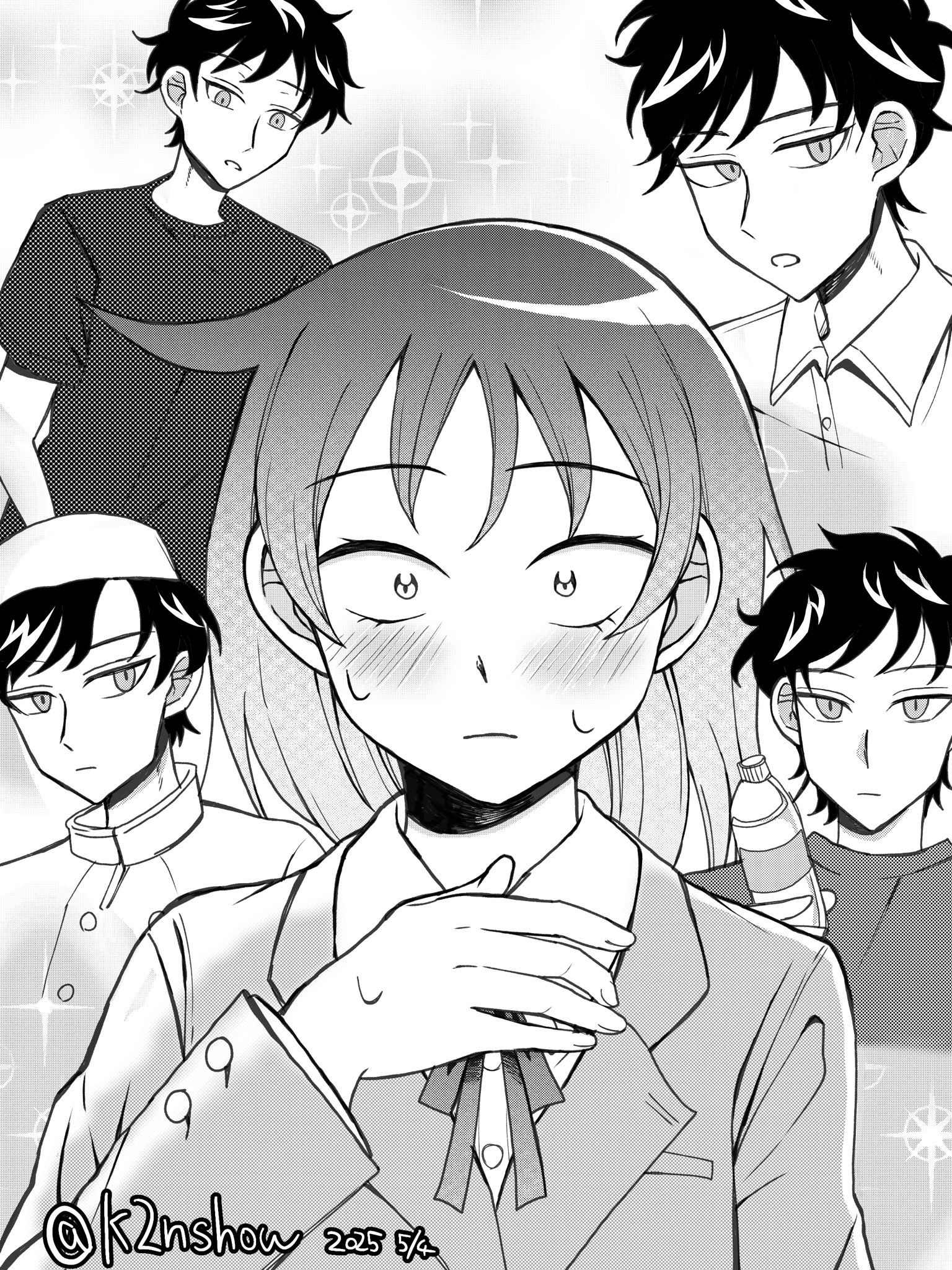 1boy 1girl bien_(k2nshow) blush bottle futsuu_no_keion-bu hatono_chihiro highres mizuo_haruichi monochrome school_uniform shirt sparkle sparkle_background t-shirt twitter_username waiter water_bottle