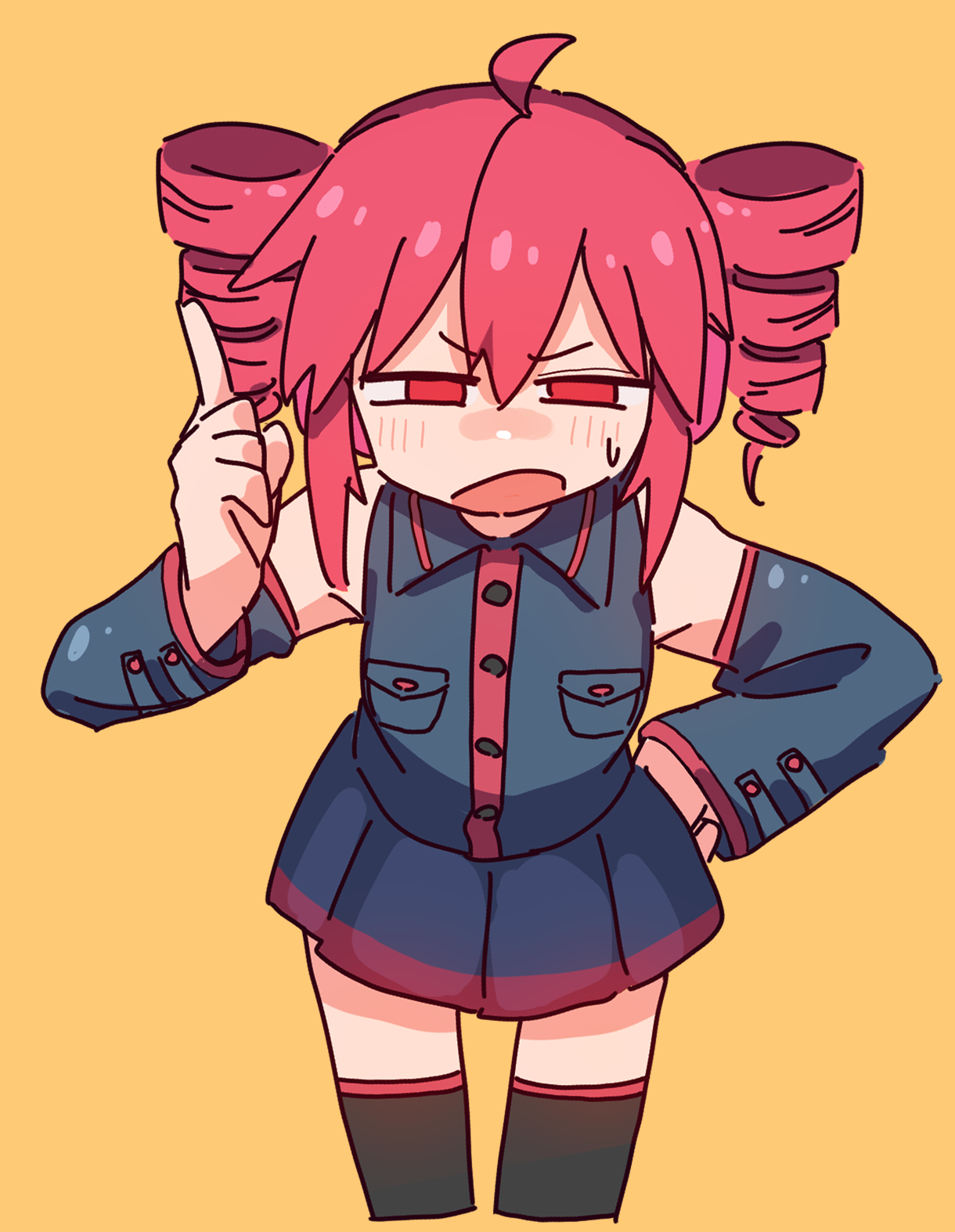 1girl ahoge black_shirt black_skirt commentary_request cowboy_shot detached_sleeves drill_hair highres index_finger_raised kasane_teto kasane_teto_(utau) open_mouth red_eyes shikemoku shirt sidelocks simple_background skirt sleeveless sleeveless_shirt solo sweatdrop utau yellow_background