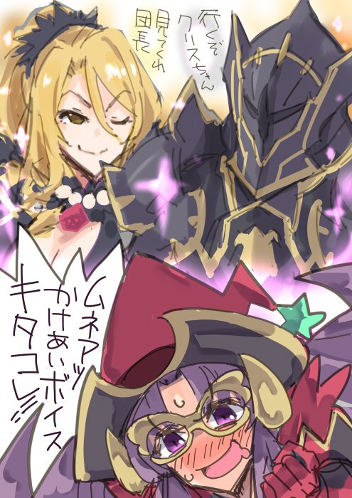 3girls ;) armor black_armor blonde_hair blush breasts christina_(princess_connect!) cleavage closed_mouth drooling gloves hair_between_eyes hat ito_ryo jun_(princess_connect!) large_breasts long_hair mouth_drool multiple_girls nanaka_(princess_connect!) nose_blush one_eye_closed parted_bangs ponytail princess_connect! purple_eyes purple_hair red_gloves red_hat smile split_mouth translation_request v-shaped_eyebrows witch_hat