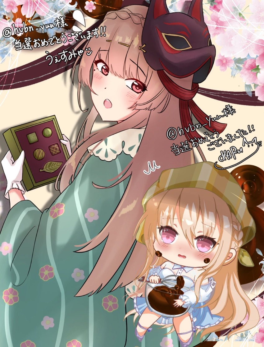 2girls blonde_hair braid brown_hair chocolate crown_braid cyon_v fox_mask hair_between_eyes hair_ornament hair_over_one_eye hair_stick heaven_burns_red japanese_clothes kiryuu_miya long_hair mask mask_on_head multiple_girls red_eyes shirakawa_yuina sidelocks wide_sleeves