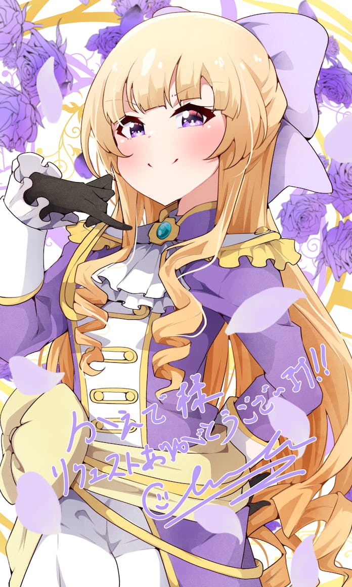 1girl ascot battle_girl_high_school black_gloves blonde_hair blush bow clark_grimms commission eyelashes flower gloves hair_bow jacket long_hair looking_at_viewer pants purple_eyes purple_flower purple_jacket purple_rose rose sendouin_kaede skeb_commission solo very_long_hair white_ascot white_pants