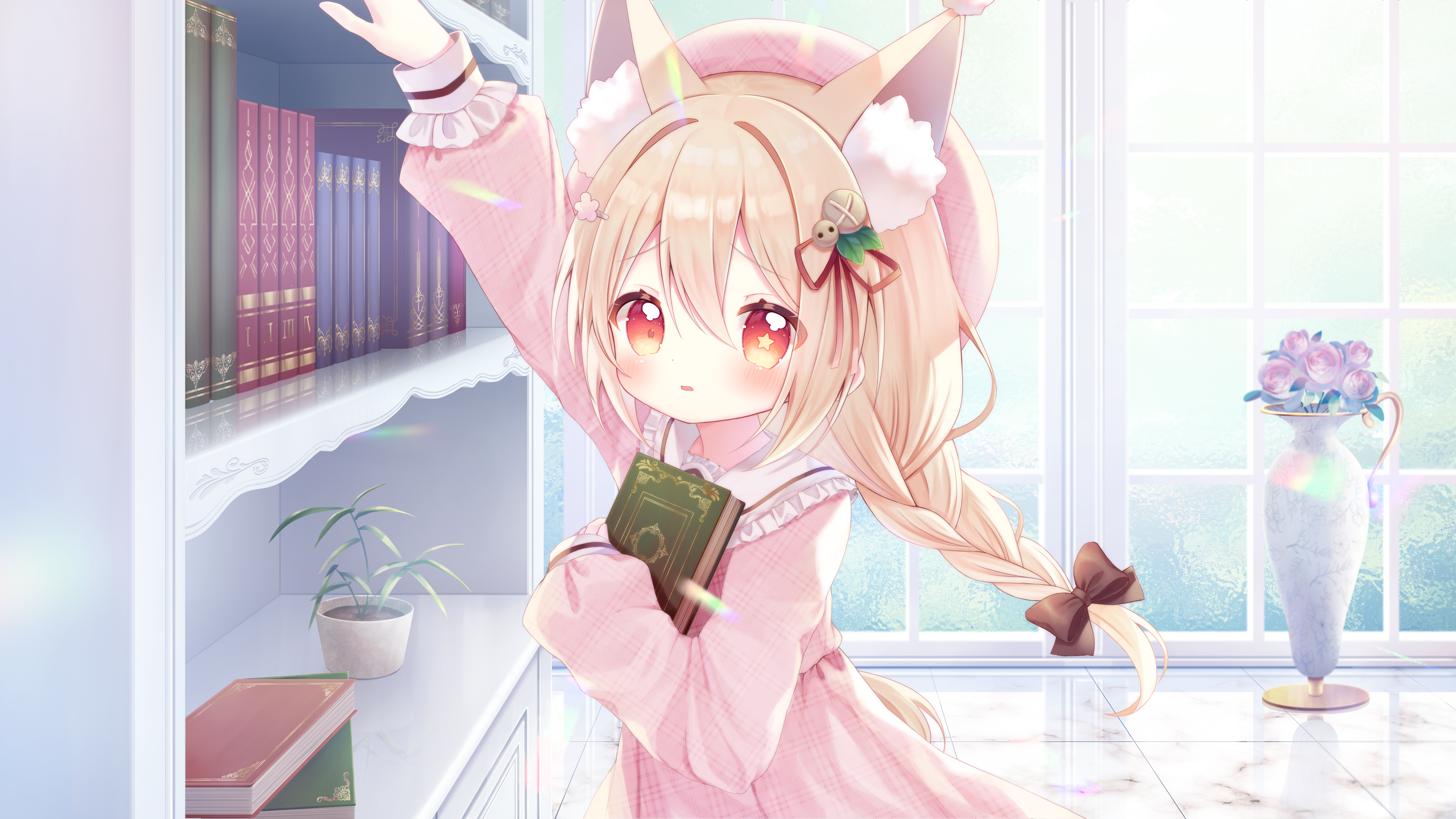 1girl absurdres animal_ear_fluff animal_ears arm_up beret blonde_hair book bow braid brown_bow collared_dress commentary_request commission dress extra_ears flower furrowed_brow gradient_eyes hair_between_eyes hair_bow hair_flower hair_ornament hair_ribbon hanamura_lily hat highres holding holding_book long_hair long_sleeves looking_at_viewer mismatched_pupils momose_kumino multicolored_eyes open_mouth original pink_dress red_eyes red_ribbon ribbon skeb_commission solo star-shaped_pupils star_(symbol) symbol-shaped_pupils twin_braids two-tone_eyes yellow_eyes yellow_pupils