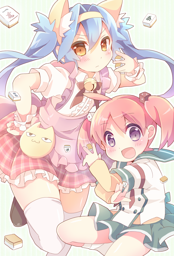 2girls animal_ear_fluff animal_ears apron bell blue_hair bow bowtie center_frills closed_mouth collared_shirt commentary_request extra_ears frilled_apron frilled_wrist_cuffs frills green_sailor_collar green_skirt hair_between_eyes hair_intakes hand_on_own_hip holding holding_mahjong_tile jingle_bell layered_sleeves long_hair long_sleeves looking_at_viewer mahjong mahjong_tile medium_hair miniskirt multiple_girls neck_bell neneko-n original pink_apron pink_hair plaid_clothes plaid_skirt purple_eyes red_bow red_bowtie red_skirt red_wrist_cuffs sailor_collar shirt short_over_long_sleeves short_sleeves skirt smile thighhighs twintails white_shirt white_thighhighs wrist_cuffs yellow_eyes