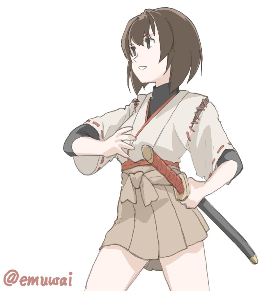 1girl brown_eyes brown_hair brown_hakama brown_skirt cowboy_shot emuwai fighting_stance hakama hakama_short_skirt hakama_skirt hyuuga_(kancolle) japanese_clothes kantai_collection kosode one-hour_drawing_challenge ready_to_draw sheath sheathed short_hair simple_background skirt solo standing sword twitter_username undershirt weapon white_background