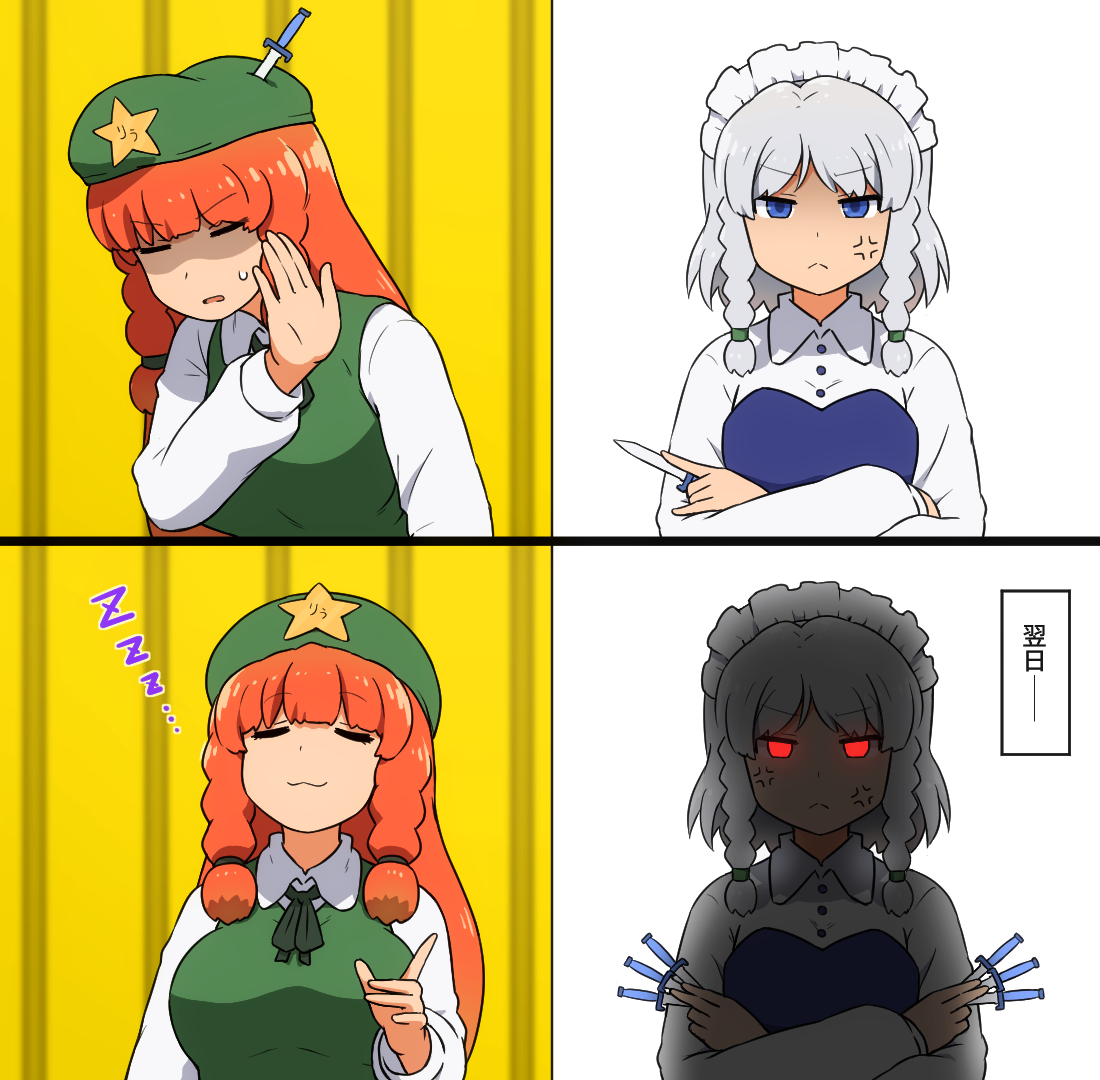 2girls anger_vein beret blue_dress blue_eyes bow braid breasts closed_eyes closed_mouth collared_shirt commentary crossed_arms drakeposting_(meme) dress glowing glowing_eyes green_bow green_dress green_hat grey_hair hat holding holding_knife hong_meiling izayoi_sakuya knife knife_in_head large_breasts long_hair maid maid_headdress meme multiple_girls object_through_head orange_hair parted_lips red_eyes shirosato shirt sleeping sleeping_upright small_sweatdrop star_(symbol) sweat untranslatable_commentary touhou twin_braids white_shirt zzz