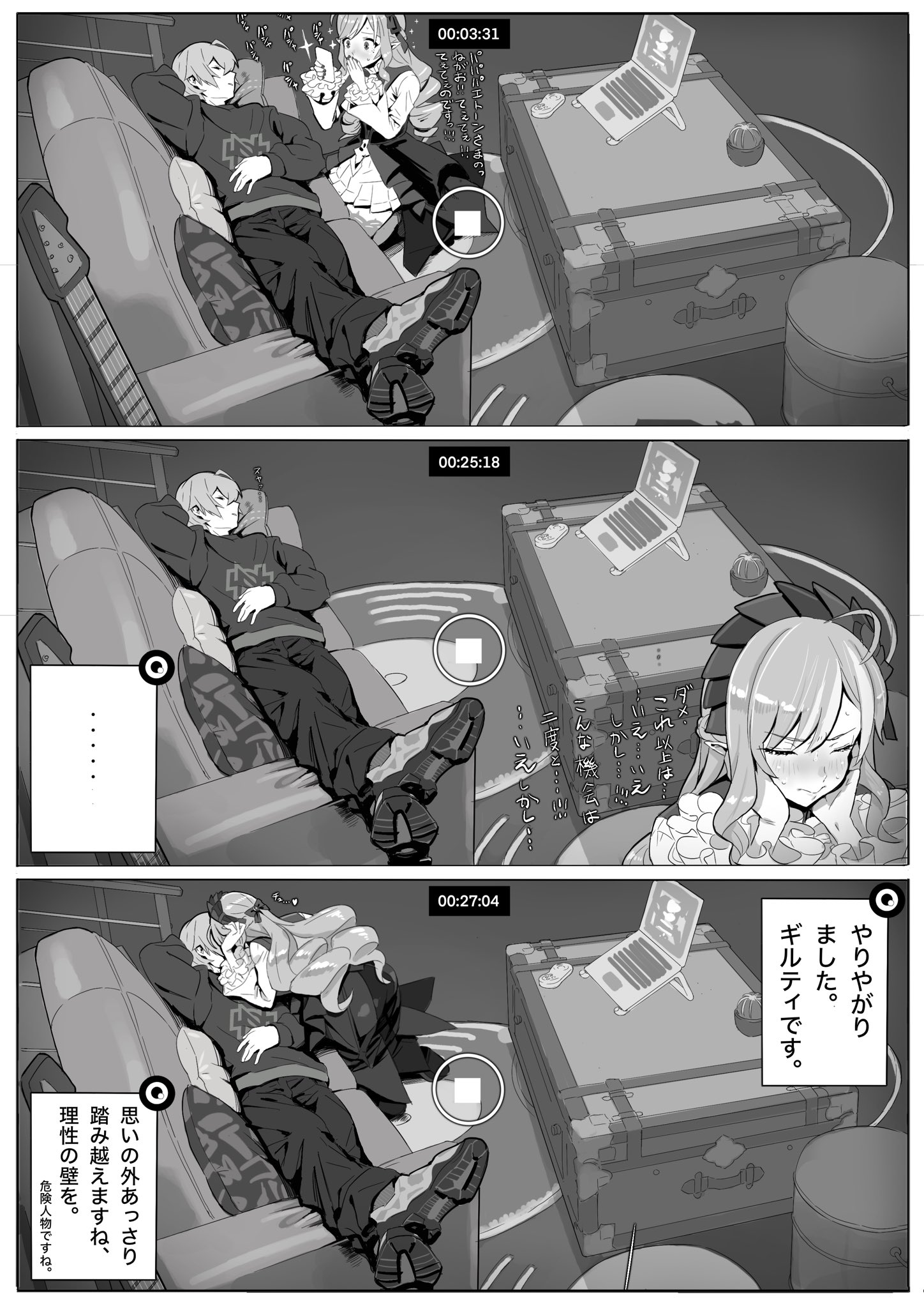 1boy 1girl closed_eyes computer couch drill_hair greyscale highres kiss laptop long_hair long_sleeves mazarimon monochrome recording shoes sleeping translation_request vivian_banshee wise_(zenless_zone_zero) zenless_zone_zero