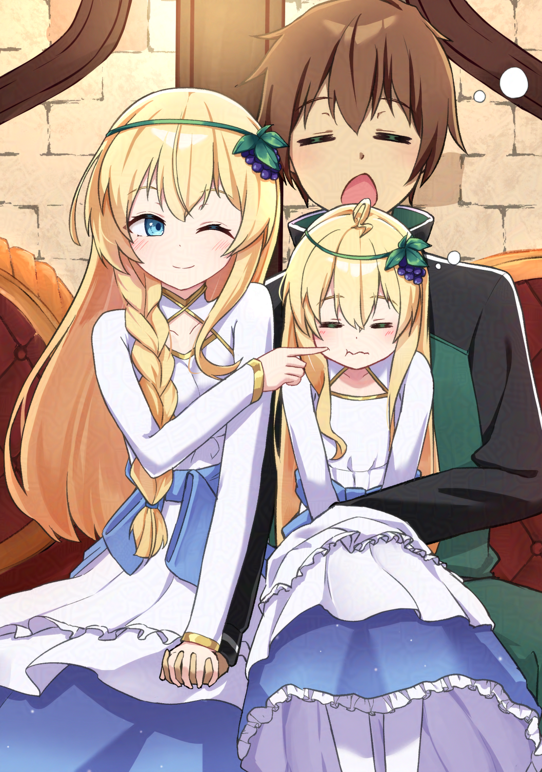 1boy 2girls :t ;) adversarial_noise blonde_hair blue_eyes blue_skirt blush braid breasts brick_wall brown_hair cheek_poking closed_eyes closed_mouth collarbone commentary_request dress father_and_child father_and_daughter frilled_skirt frills green_jacket green_pants hair_between_eyes highres if_they_mated iris_(konosuba) jacket kono_subarashii_sekai_ni_shukufuku_wo! long_hair mother_and_child mother_and_daughter multiple_girls nenosame one_eye_closed open_mouth pants pantyhose parent_and_child poking satou_kazuma single_braid sitting sitting_on_lap sitting_on_person skirt small_breasts smile track_jacket track_pants track_suit very_long_hair wavy_mouth white_dress white_pantyhose