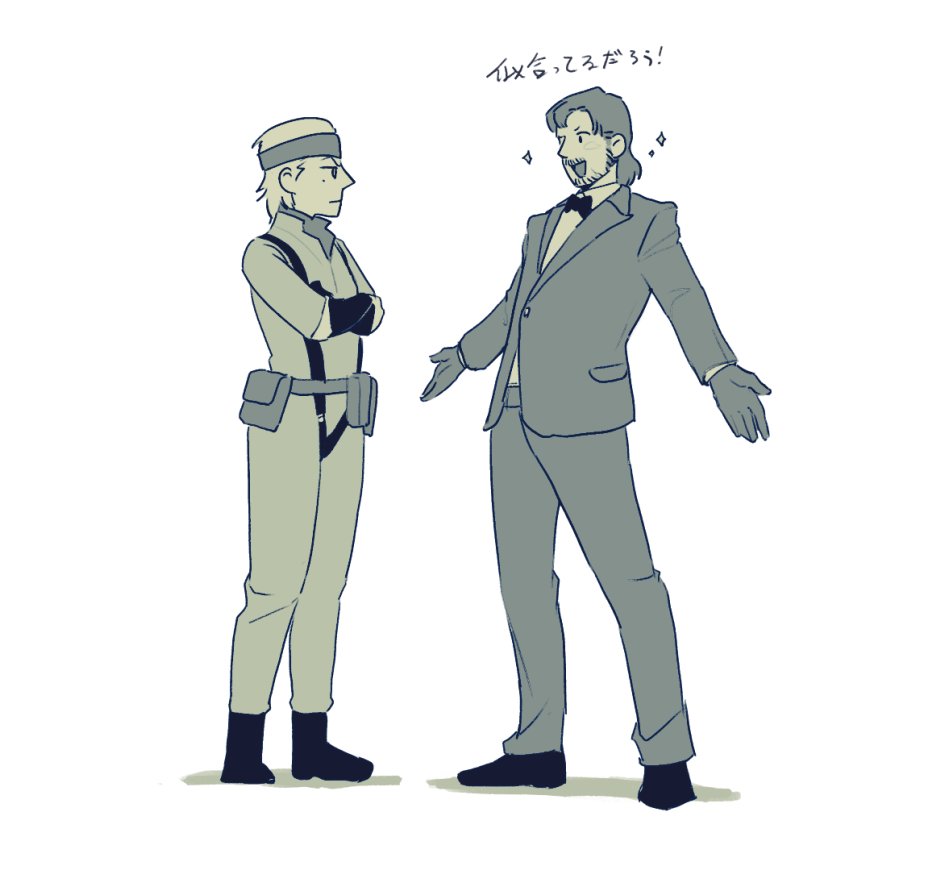 1boy 1girl bandana big_boss formal_clothes gloves metal_gear_(series) metal_gear_solid_3:_snake_eater naked_snake souyuu suit the_boss tuxedo