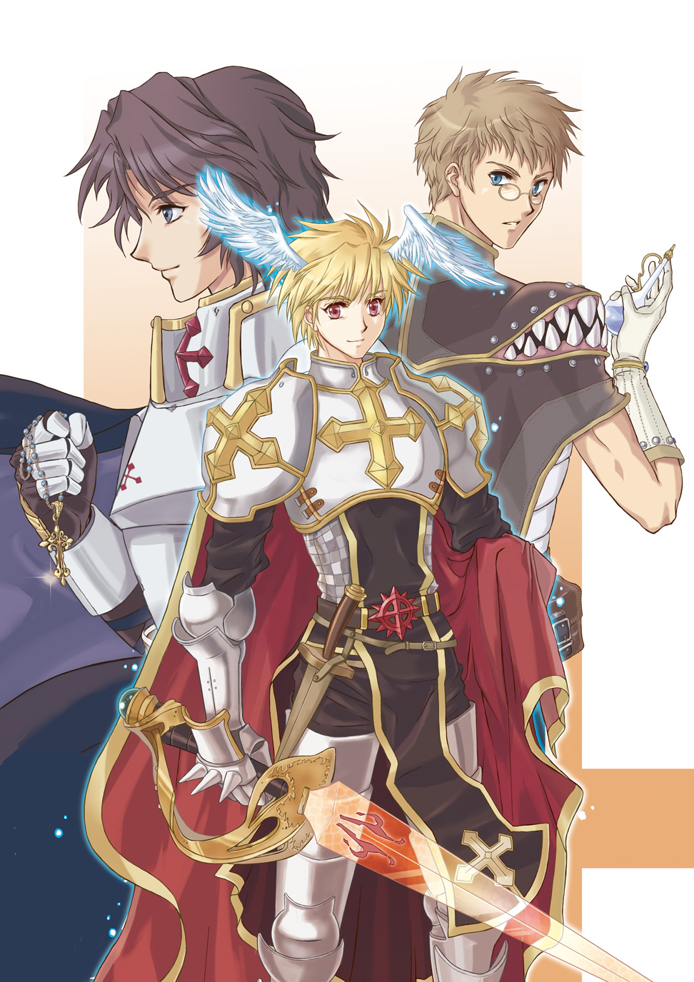 2000s_(style) 3boys armor armored_boots belt black_belt black_tabard blonde_hair blue_cape blue_eyes boots breastplate brown_cape brown_hair cape chainmail closed_mouth commentary_request creator_(ragnarok_online) cross cross_of_prontera feathered_wings feet_out_of_frame flask gauntlets gloves green_eyes head_wings highres holding holding_sword holding_weapon leg_armor looking_at_viewer lord_knight_(ragnarok_online) male_focus multiple_boys paladin_(ragnarok_online) pauldrons potion ragnarok_online red_cape red_eyes round-bottom_flask shijou_satori short_bangs short_hair shoulder_armor smile spiked_gauntlets sword tabard weapon white_background white_gloves white_wings wings