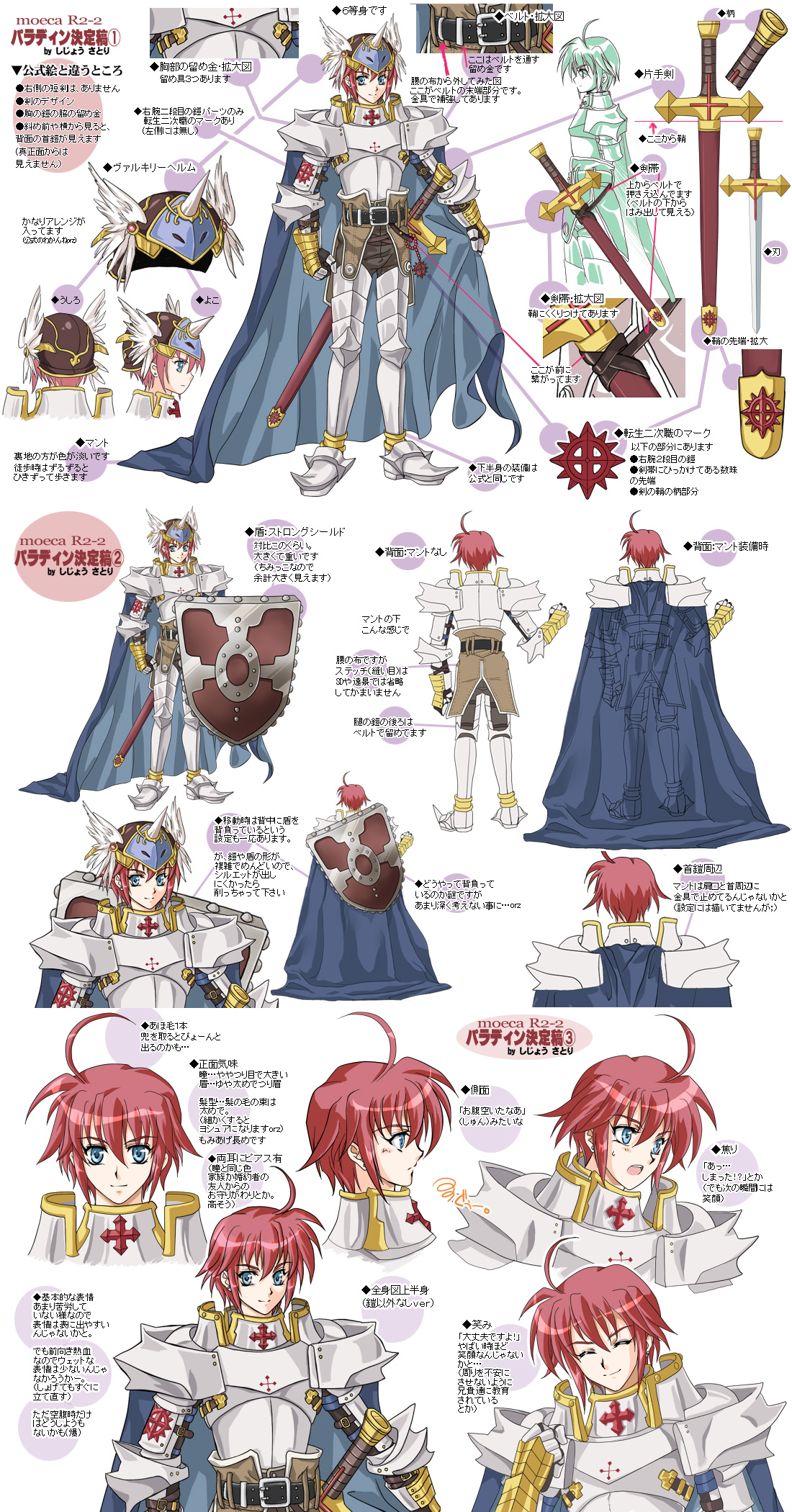 1boy 2000s_(style) ahoge armor armored_boots belt black_belt blue_cape blue_eyes boots breastplate brown_pants cape closed_eyes closed_mouth commentary_request cross cross_of_prontera fake_horns full_body gauntlets helmet highres holding holding_shield horned_helmet horns leg_armor male_focus multiple_views open_mouth paladin_(ragnarok_online) pants pauldrons ragnarok_online red_hair reference_sheet shield shijou_satori short_hair shoulder_armor simple_background single_horn smile translation_request upper_body white_background