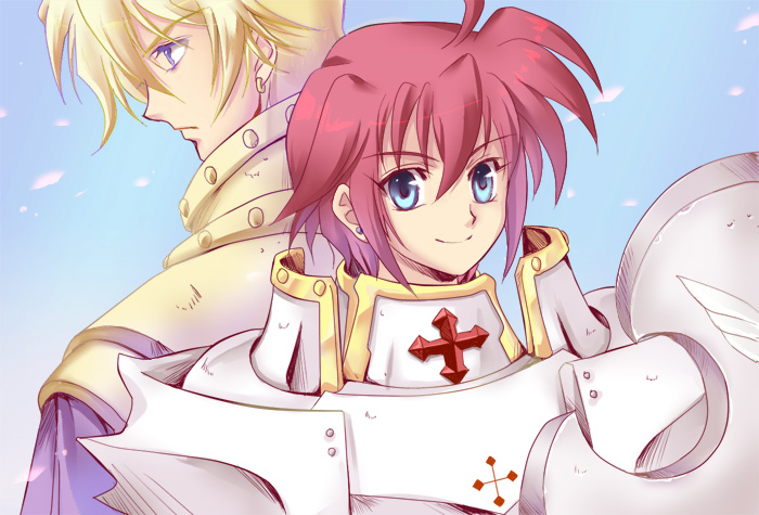 2000s_(style) armor back-to-back blonde_hair blue_background blue_eyes breastplate closed_mouth commentary_request cross crusader_(ragnarok_online) earrings hair_between_eyes holding holding_shield jewelry looking_afar looking_at_viewer paladin_(ragnarok_online) pauldrons purple_eyes ragnarok_online red_hair shield shijou_satori short_hair shoulder_armor smile stud_earrings upper_body