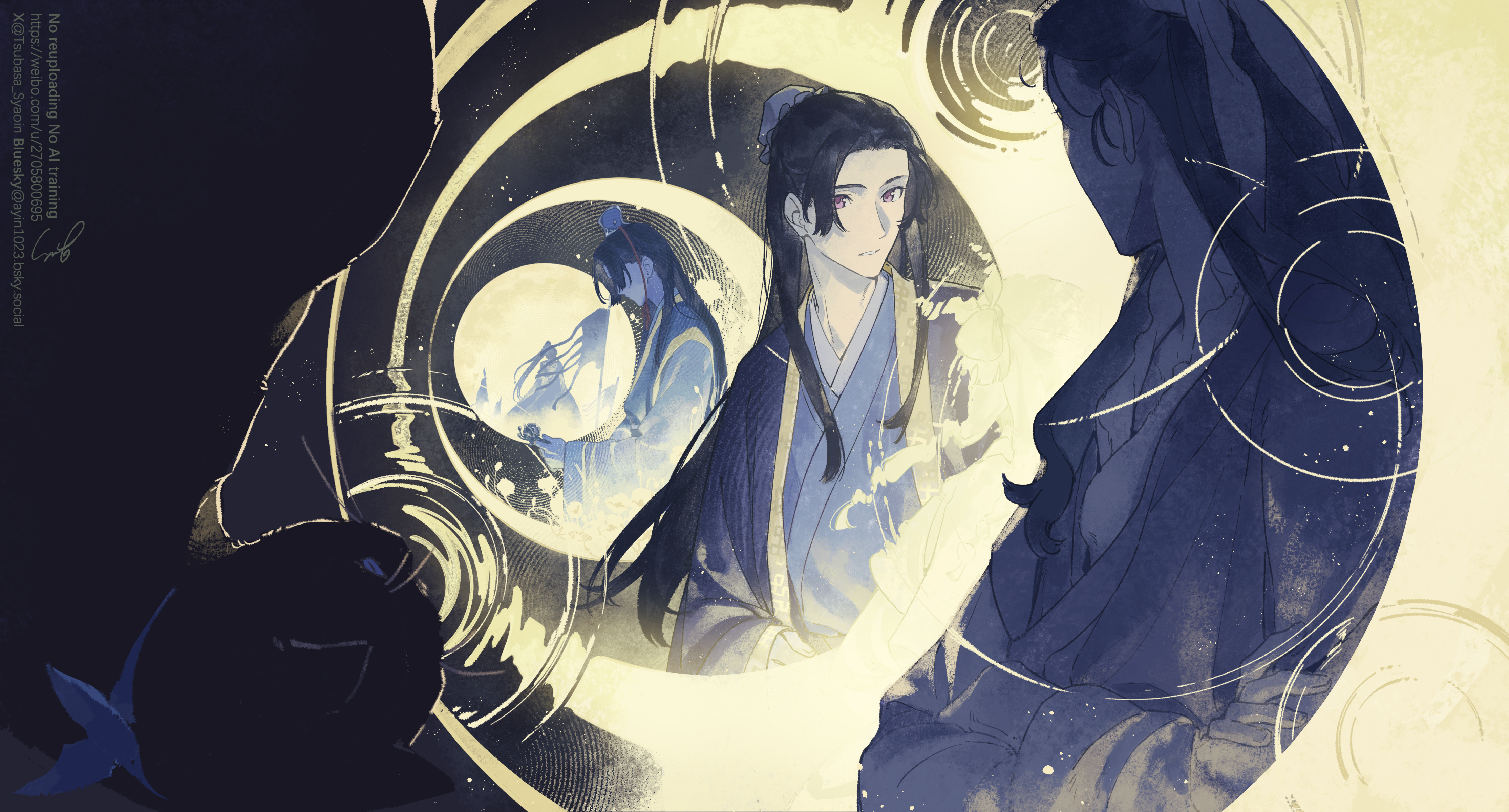 1boy absurdres black_hair blue_hanfu chinese_clothes chinese_commentary flag hair_bun half_updo hanfu highres jinshi_(kusuriya_no_hitorigoto) kusuriya_no_hitorigoto long_hair looking_at_another multiple_views parted_bangs parted_lips purple_eyes ripples tsubsa_syaoin upper_body