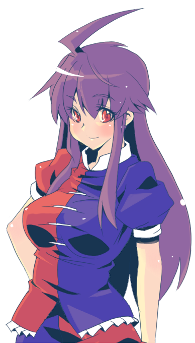 1girl ahoge blue_shirt blush breasts closed_mouth commentary_request cosplay long_hair looking_at_viewer medium_breasts mori_shin_risuku morswa puffy_short_sleeves puffy_sleeves purple_hair red_eyes red_shirt shirt short_sleeves sidelocks simple_background smile solo touhou two-tone_shirt upper_body white_background yagokoro_eirin yagokoro_eirin_(cosplay)