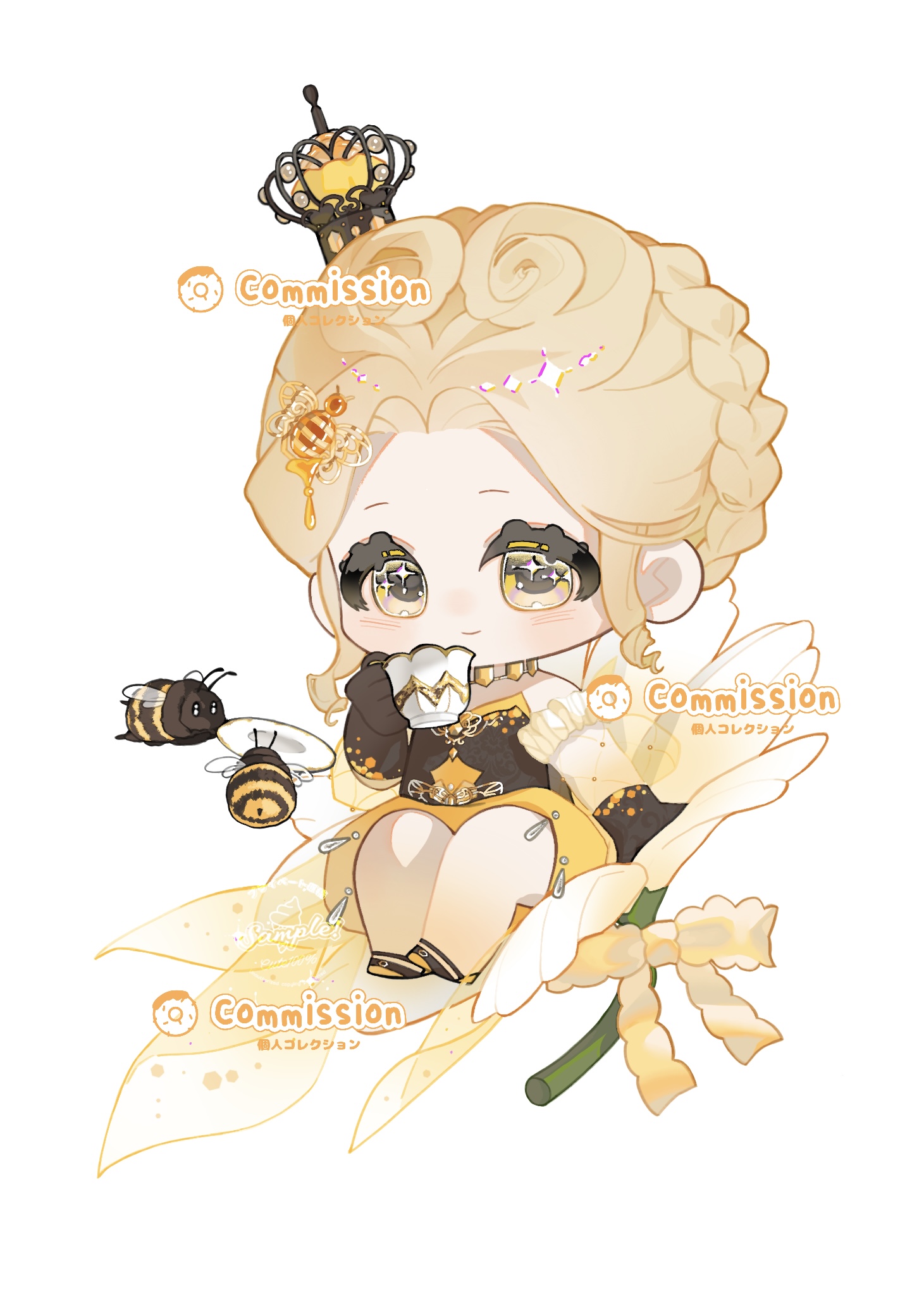 1girl bare_legs bee bee_costume bee_hair_ornament belt belt_buckle black_belt black_gloves black_shirt black_shoes blonde_hair bow braid buckle bug chain character_request chibi chinese_commentary circlet closed_mouth commentary_request commission crown crown_braid cup curly_hair detached_sleeves drinking eeeestella eyelashes flower frilled_sleeves frills fringe_trim gloves gold_chain hair_ornament hairclip happy highres holding holding_cup insect light_blush long_sleeves mini_crown miniskirt multicolored_shoes nikki_(series) on_flower shining_nikki shirt shoe_belt shoes short_hair simple_background sitting skirt smile solo sparkling_eyes strapless strapless_shirt tareme teacup train_(clothing) two-tone_shoes updo watermark white_background white_flower white_sleeves yellow_bow yellow_crown yellow_eyes yellow_shoes yellow_skirt
