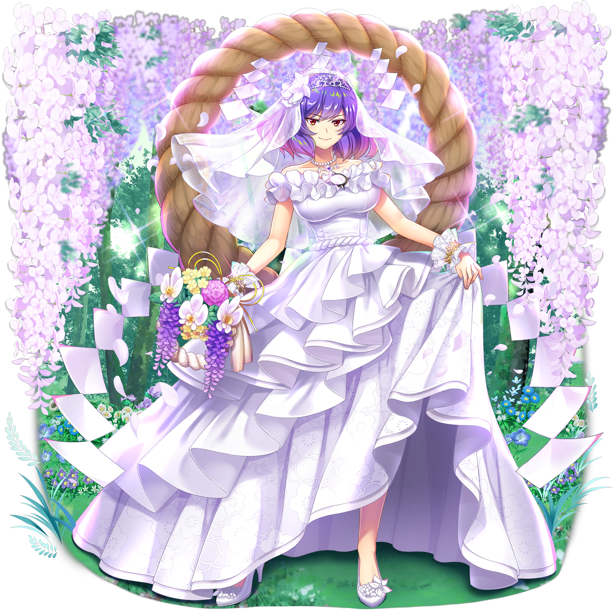 1girl allium_(flower) alternate_costume breasts bridal_veil buttercup_(flower) closed_mouth collarbone daisy_(flower) dress falling_petals flax_(flower) floral_print flower flower_basket footwear_flower frilled_dress frills full_body game_cg highres holding_own_dress jewelry large_breasts looking_at_viewer medium_hair mirror necklace nemophila_(flower) off-shoulder_dress off_shoulder official_art orchid pendant petals plum_blossom_print primrose_(flower) print_dress purple_flower purple_hair red_eyes rope rotte_(1109) see-through_clothes see-through_veil shide shimenawa shoes smile solo sparkle standing third-party_source tiara touhou touhou_lostword transparent_background veil wedding_dress white_dress white_flower white_shoes white_veil wisteria wrist_cuffs yasaka_kanako yasaka_kanako_(era-defining_white_onbashira) yellow_flower