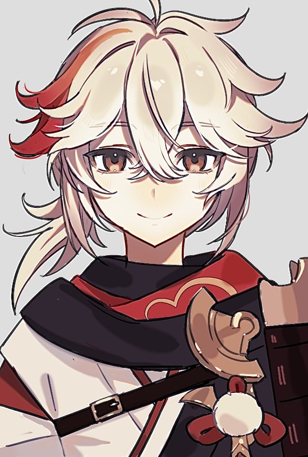 1boy armor commentary crossed_bangs genshin_impact grey_background hair_between_eyes japanese_armor japanese_clothes kaedehara_kazuha looking_at_viewer male_focus multicolored_hair ponytail red_hair simple_background sky_yoichi smile solo streaked_hair untranslatable_commentary upper_body white_hair
