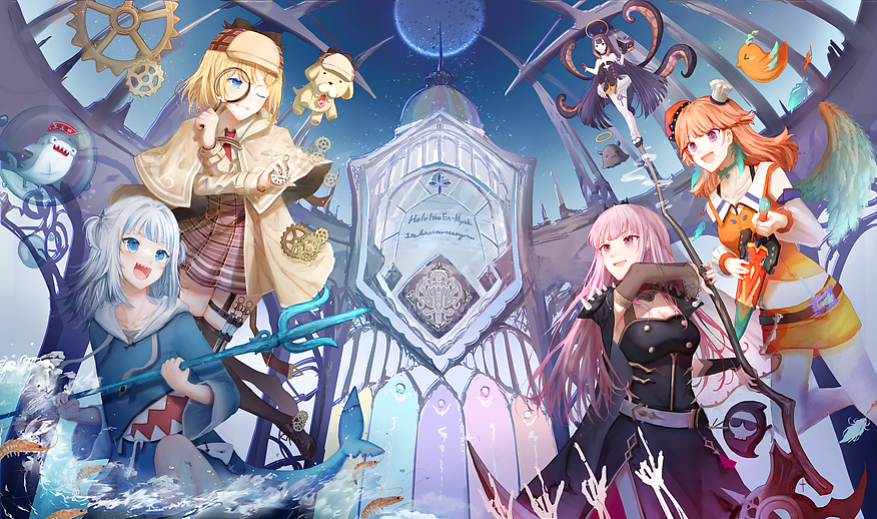5girls beret black_cape black_hair blonde_hair bloop_(gawr_gura) blue_eyes blue_hair blue_hoodie bubba_(watson_amelia) cape chef_hat coat deadbeat_(mori_calliope) death-sensei_(mori_calliope) deerstalker dress ebi-chan_(gawr_gura) fins fish_tail gawr_gura gears halo hat high-waist_skirt holding holding_polearm holding_scythe holding_sword holding_weapon hololive hololive_english holomyth hood hoodie kfp_employee_(takanashi_kiara) long_hair magnifying_glass medium_hair mini_chef_hat mini_hat mori_calliope multicolored_hair multiple_girls necktie ninomae_ina'nis orange_hair orange_shirt orange_skirt pictor pink_eyes pink_hair plaid_clothes plaid_skirt polearm red_hat scythe shark_girl shark_tail shirt short_twintails skirt sleeveless sleeveless_dress sword tail takanashi_kiara takodachi_(ninomae_ina'nis) tentacles thighhighs trident twintails two-tone_hair virtual_youtuber watson_amelia weapon white_dress white_hair white_shirt white_thighhighs wings yellow_coat