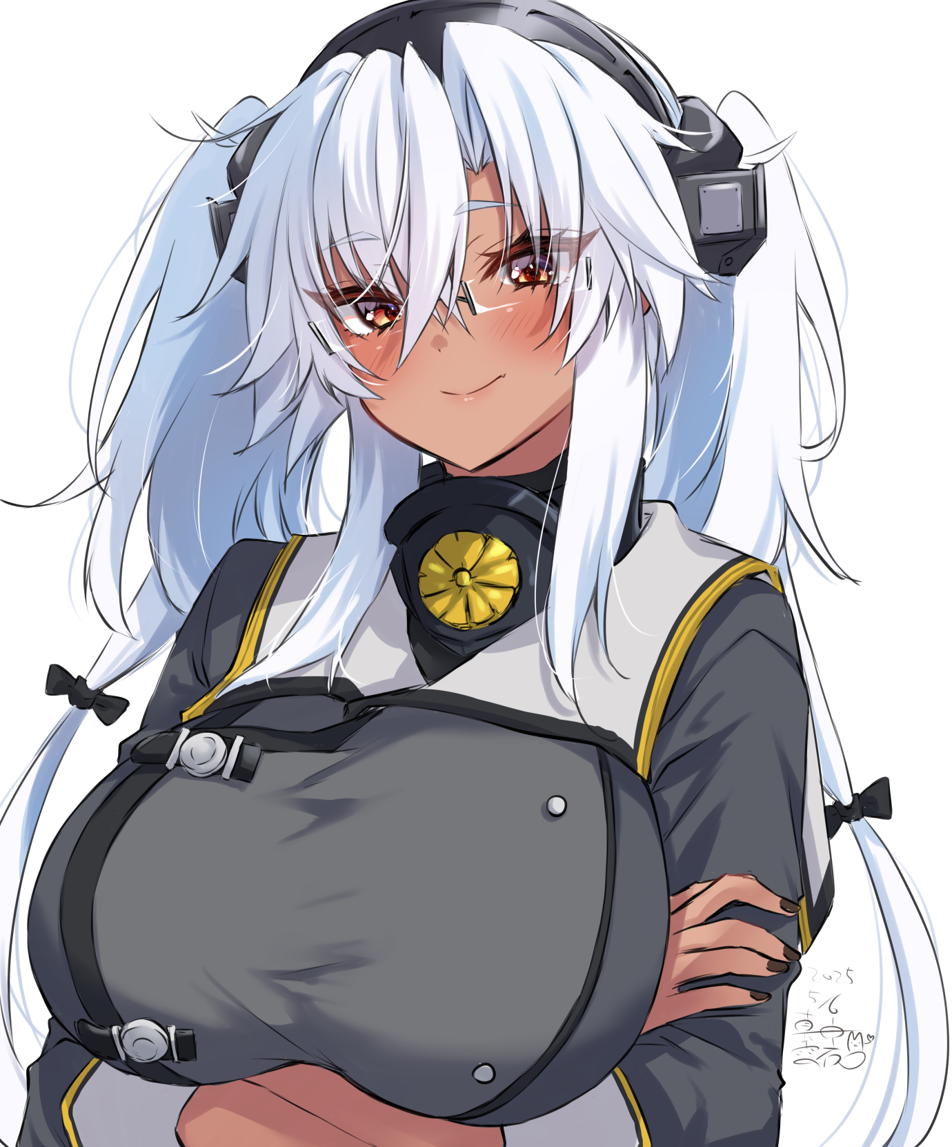 1girl black_nails blush breasts brown_eyes crossed_arms dark-skinned_female dark_skin dated glasses grey_hair hair_between_eyes headgear highres kantai_collection large_breasts long_hair looking_at_viewer mashiro_yukiya musashi_(kancolle) musashi_kai_ni_(kancolle) pointy_hair rectangular_eyewear rimless_eyewear semi-rimless_eyewear signature smile solo twintails upper_body very_long_hair white_background white_hair