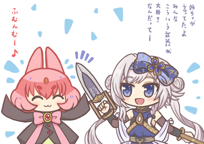 2girls :3 :d ^_^ animal_ears bad_id bad_twitter_id blue_bow blue_dress blue_eyes blush bow braid chibi closed_eyes detached_sleeves double_bun dress grey_hair hair_bow hair_bun holding holding_weapon long_hair long_sleeves looking_at_another magia_record:_mahou_shoujo_madoka_magica_gaiden magical_girl mahou_shoujo_madoka_magica multiple_girls musical_note open_mouth pink_bow pink_hair reverse_(bluefencer) sawa_sudachi shirt sidelocks simple_background smile thick_eyebrows twintails very_long_hair weapon white_background yakumo_mikage