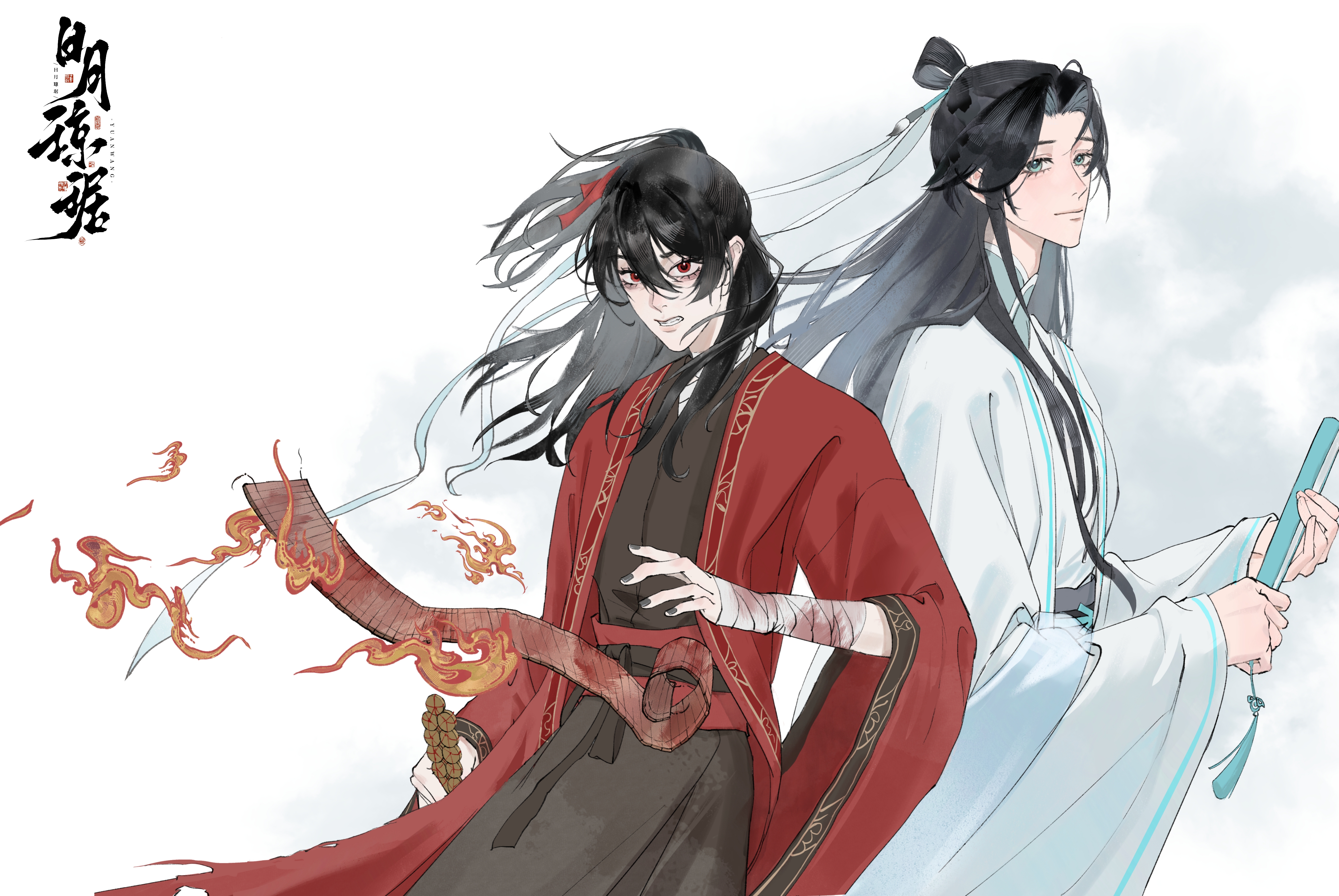 2boys absurdres aqua_eyes artist_request bags_under_eyes bandaged_arm bandaged_neck bandages bishounen black_hair black_hanfu black_nails blood blood_on_arm chinese_clothes chinese_commentary chinese_text clenched_teeth coat coin_sword commission dao_gui_yi_xian fire floating_hair folded_fan folding_fan hair_bun hair_ornament hair_ribbon hair_stick half_updo hand_fan hanfu highres holding holding_fan holding_sword holding_weapon li_huowang long_hair long_sleeves looking_at_viewer male_focus multiple_boys nail_polish paintbrush_hair_ornament ponytail red_coat red_eyes red_ribbon red_sash ribbon robe sash scroll second-party_source single_hair_bun smile sword tassel teeth upper_body weapon white_background white_hanfu wide_sleeves yaoi zhuge_yuan