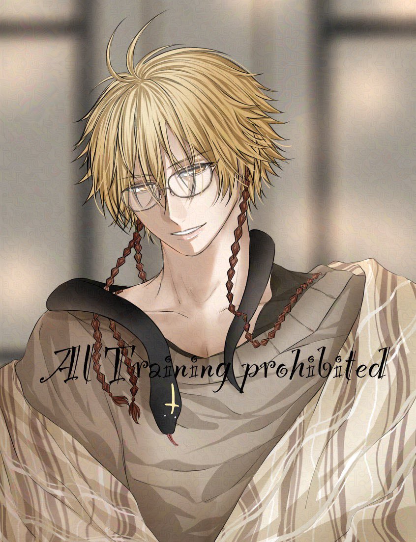 1boy ahoge alicein_mikuni bad_link bishounen blonde_hair braid brown_shirt doubt_doubt doubt_doubt_(snake_form) glasses kutinasi9 male_focus orange_eyes servamp shirt short_hair side_braid