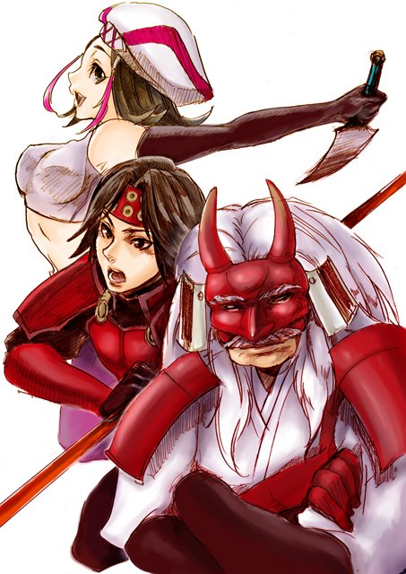 brown_hair crop_top crossed_arms dagger headband japanese_clothes knife kunoichi_(sengoku_musou) mask polearm sanada_yukimura_(sengoku_musou) sengoku_musou spear takeda_shingen_(sengoku_musou) weapon