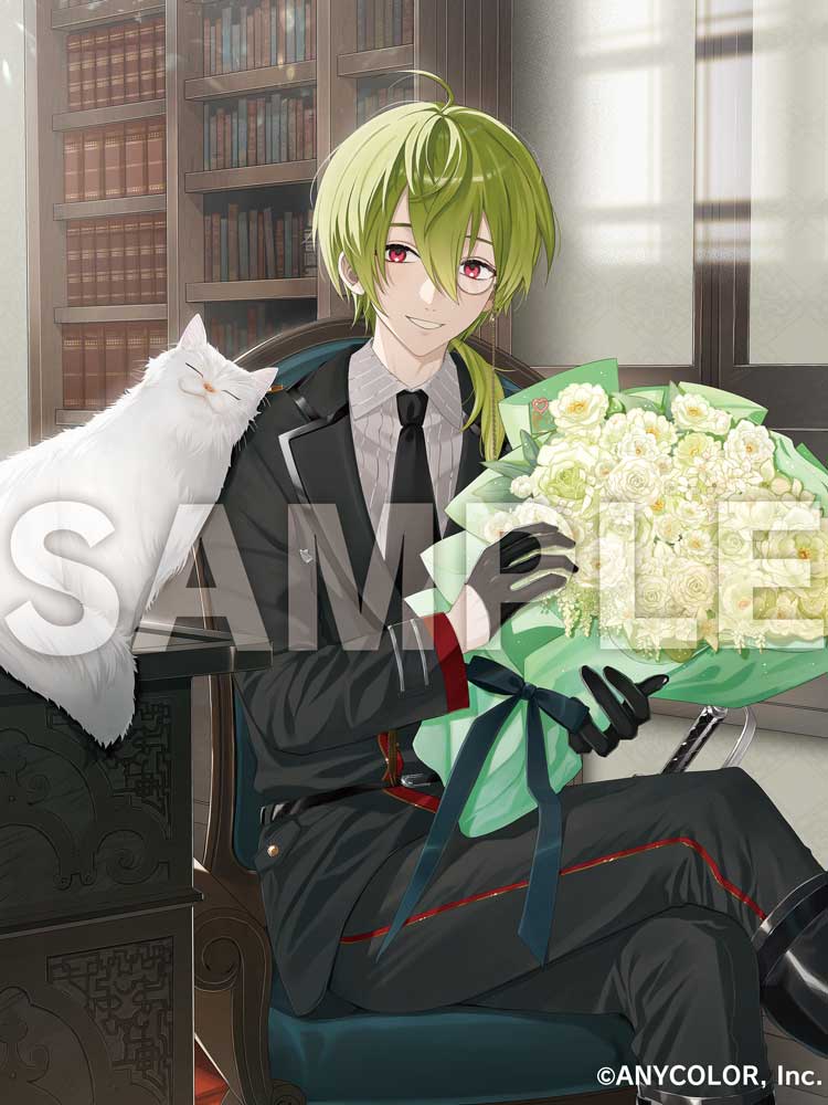 1boy :d ahoge alternate_costume ameno_(ameno_f) black_gloves black_necktie black_pants black_suit bookshelf bouquet cat collared_shirt commentary_request copyright_notice flower formal_clothes gloves green_hair grey_shirt grin holding holding_bouquet jacket looking_at_viewer male_focus medium_hair necktie nijisanji open_mouth pants pink_eyes sample_watermark shibuya_hajime shirt smile solo suit suit_jacket teeth virtual_youtuber watermark white_flower