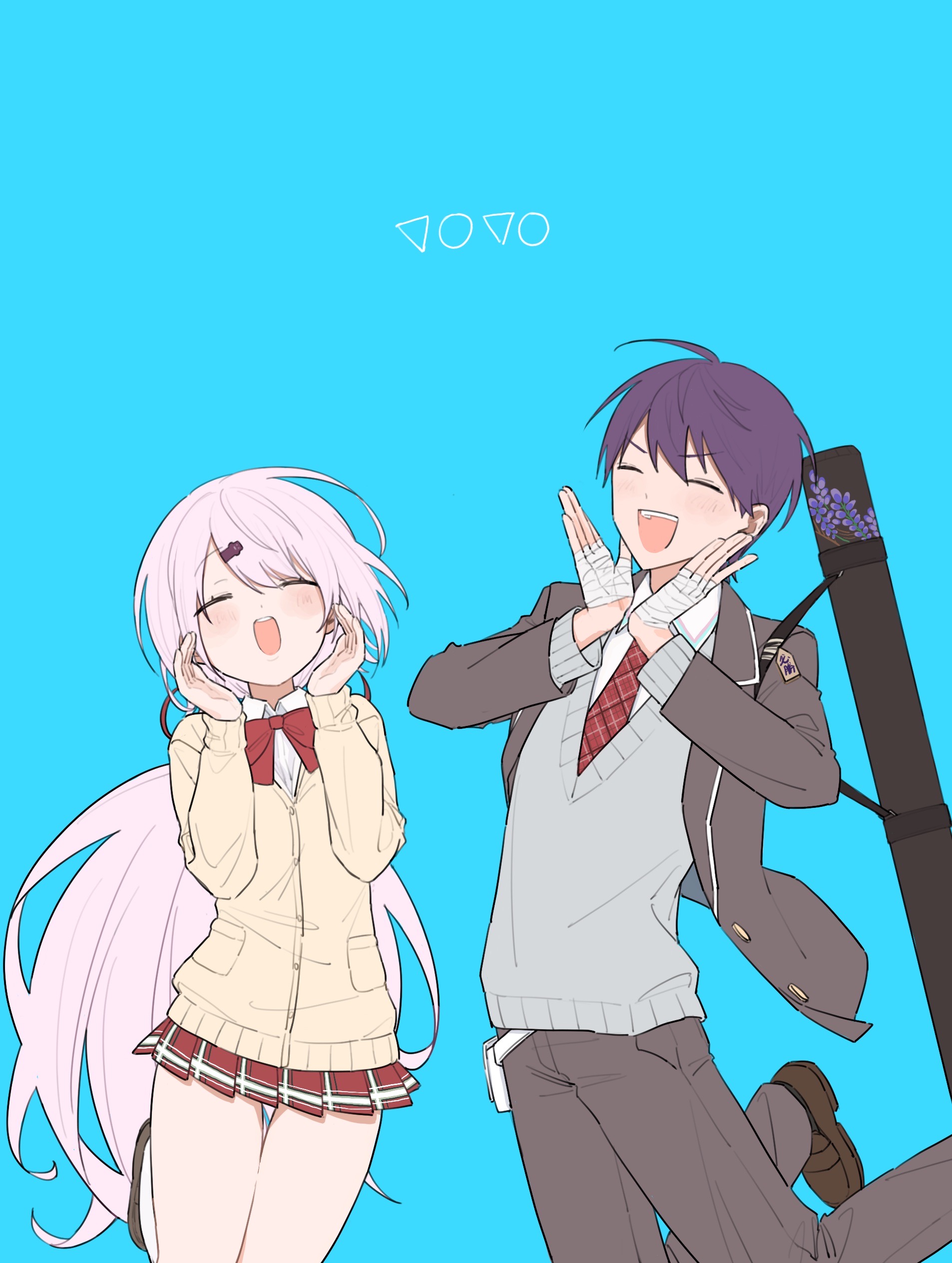 1boy 1girl :d absurdres bandaged_hand bandages blazer blue_background bow bowtie cardigan closed_eyes collared_shirt grey_jacket grey_pants grey_sweater_vest hair_ornament hair_ribbon hairclip hands_up happy highres jacket kenmochi_touya long_hair low_ponytail miniskirt necktie nijisanji omamori open_mouth pants pleated_skirt po_(po_495) ponytail purple_eyes red_bow red_bowtie red_necktie red_skirt ribbon school_uniform shiina_yuika shirt short_hair simple_background skirt smile sweater_vest v-shaped_eyebrows very_short_hair virtual_youtuber weapon_bag white_hair white_shirt yellow_cardigan