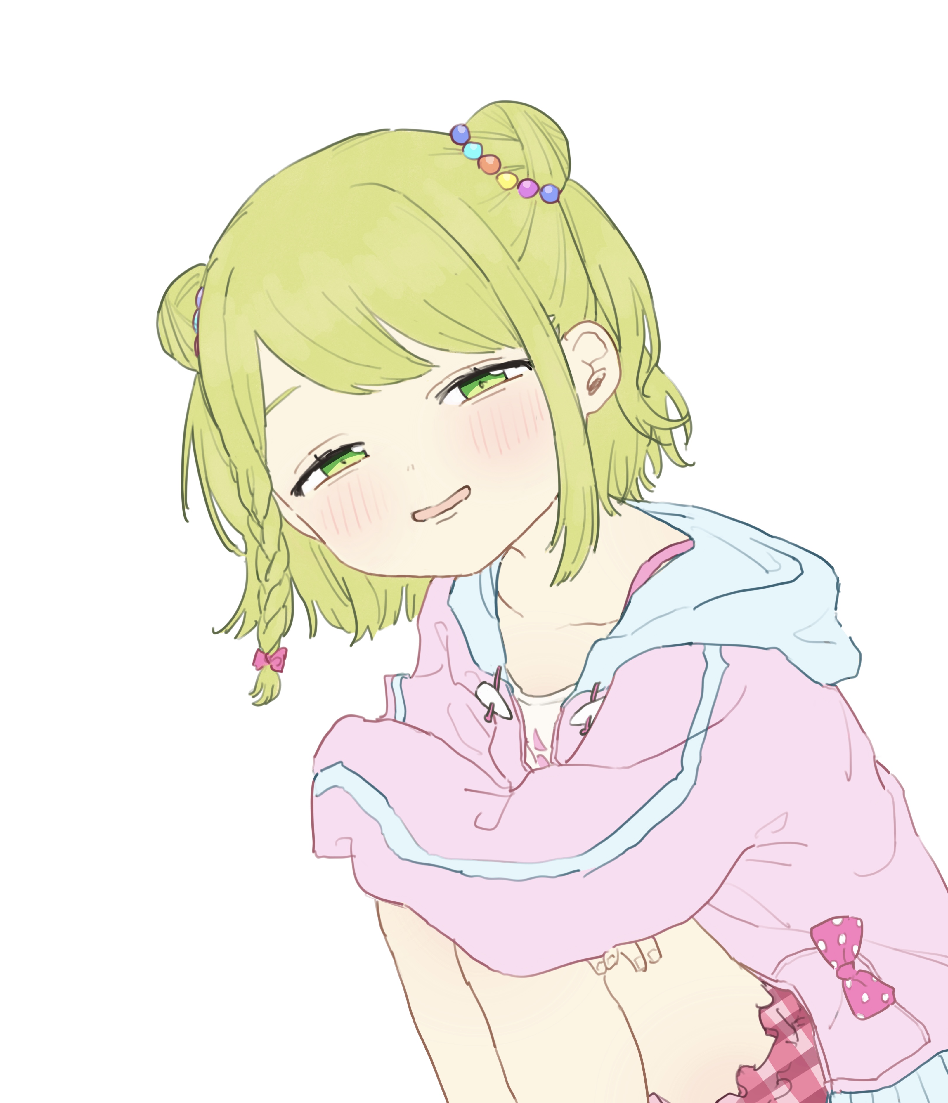 1girl absurdres blue_hood braid double_bun flat_color green_eyes green_hair hair_bun half-closed_eyes highres hood hooded_jacket jacket jojifuku looking_at_viewer morinaka_kazaki morinaka_kazaki_(8th_costume) nijisanji pink_jacket po_(po_495) shirt side_braid simple_background single_braid skirt smile solo virtual_youtuber white_background