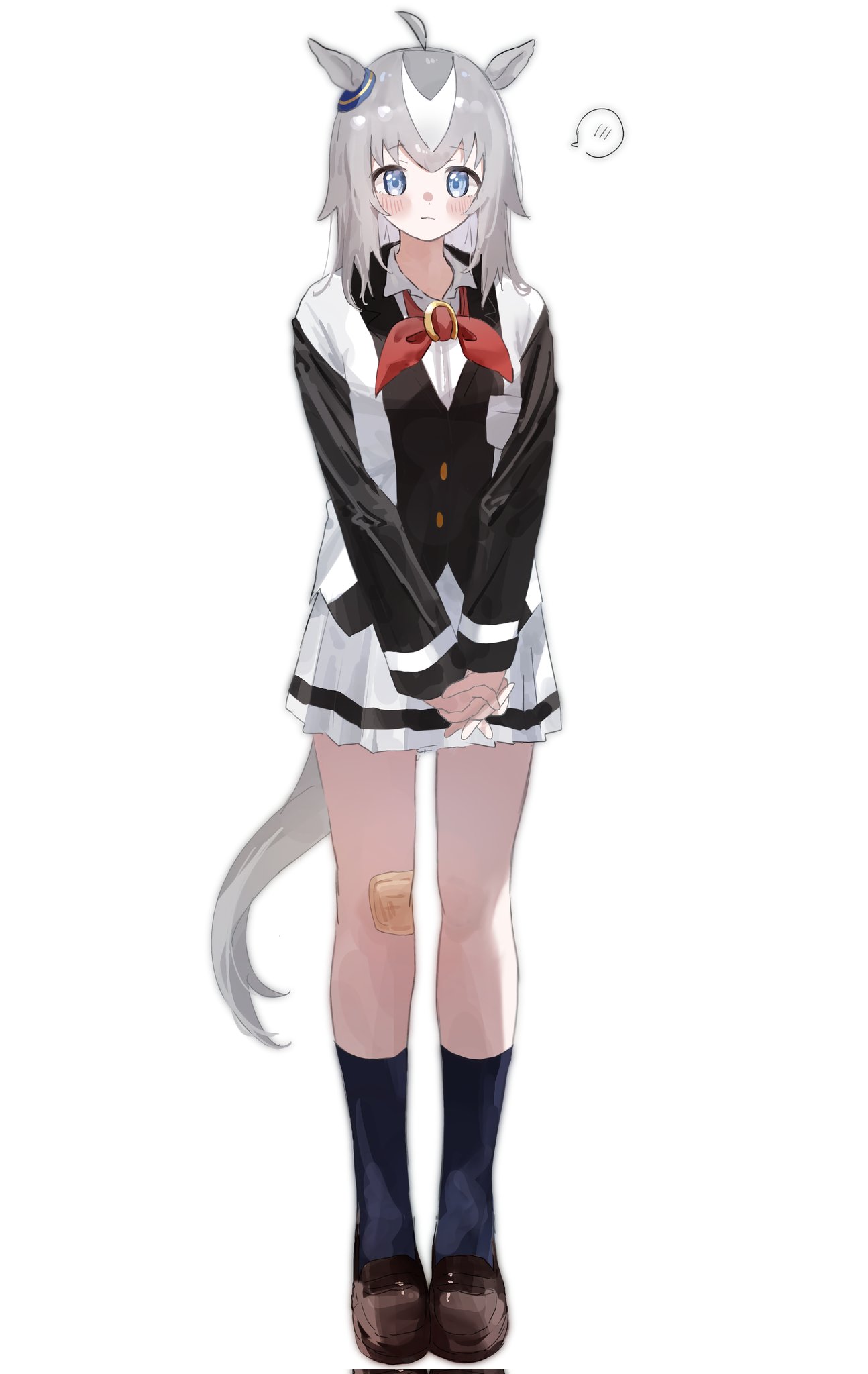 1girl aged_down ahoge animal_ears bandaid bandaid_on_knee bandaid_on_leg black_jacket black_socks blazer blue_eyes brown_shoes closed_mouth commentary dress_shirt full_body grey_hair ha_(hura76752775) highres horse_ears horse_girl horse_tail horseshoe_ornament interlocked_fingers jacket kasamatsu_tracen_school_uniform light_blush loafers long_sleeves looking_at_viewer medium_hair miniskirt neck_ribbon own_hands_together pleated_skirt red_ribbon ribbon school_uniform shirt shoes simple_background skirt smile socks solo spoken_blush standing tail umamusume umamusume:_cinderella_gray v_arms white_background white_jacket white_shirt white_skirt wing_collar