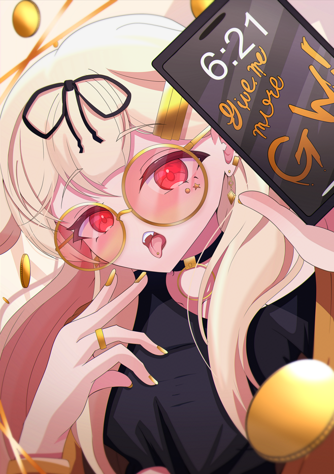 1girl :p alternate_costume black_ribbon black_shirt blonde_hair blush casual hair_ribbon hands_up holding holding_phone jewelry kantai_collection long_hair looking_at_viewer phone piercing red_eyes ribbon ring sameyan shirt solo sunglasses tongue tongue_out upper_body very_long_hair wedding_ring yellow_nails yuudachi_(kancolle) yuudachi_kai_ni_(kancolle)