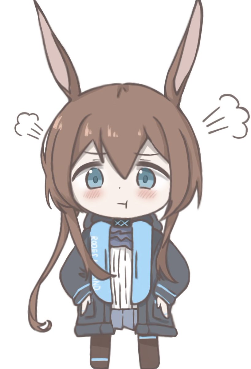 1girl amiya_(arknights) animal_ears arknights black_jacket blue_eyes blush brown_hair brown_pantyhose chibi chibi_only closed_mouth clothes_writing commentary dot_nose full_body hair_between_eyes hands_on_own_hips highres jacket long_hair long_sleeves looking_at_viewer monitor p3pp3r_pic pantyhose ponytail pout puff_of_air sidelocks simple_background solo standing white_background