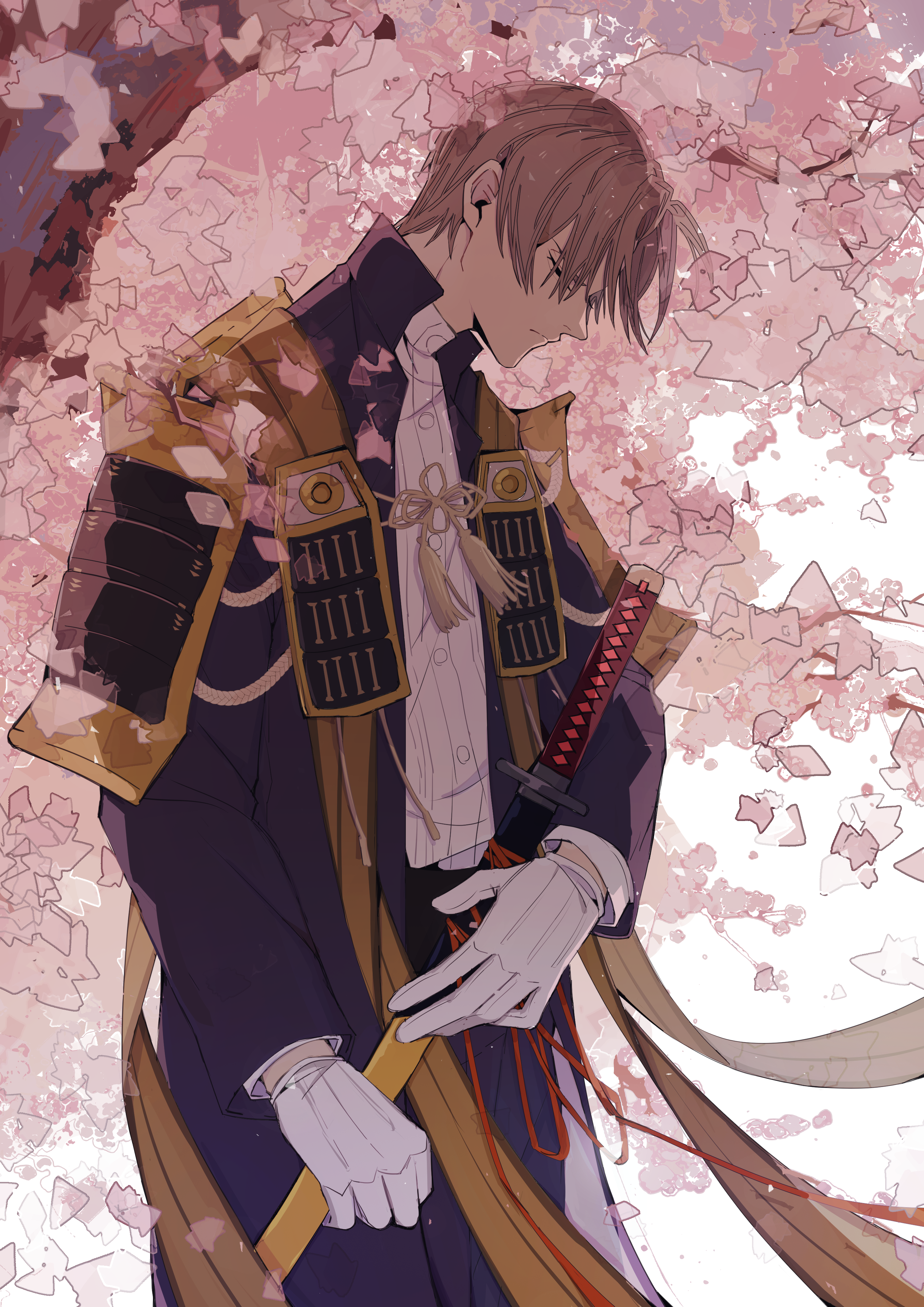 1boy absurdres armor blue_coat brown_hair cherry_blossoms closed_eyes closed_mouth coat falling_petals from_side gloves heshikiri_hasebe high_collar highres holding holding_sword holding_weapon japanese_armor katana long_sleeves petals red_ribbon ribbon shirt short_hair solo sword touken_ranbu weapon white_gloves white_shirt zenbuwasurete