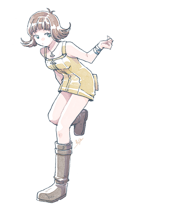 1girl artist_name bare_shoulders boots bracelet breasts brown_boots brown_hair cowlick curly_hair final_fantasy final_fantasy_viii full_body green_eyes jewelry medium_breasts medium_hair michibata_65 necklace overalls selphie_tilmitt solo standing standing_on_one_leg white_background yellow_overalls