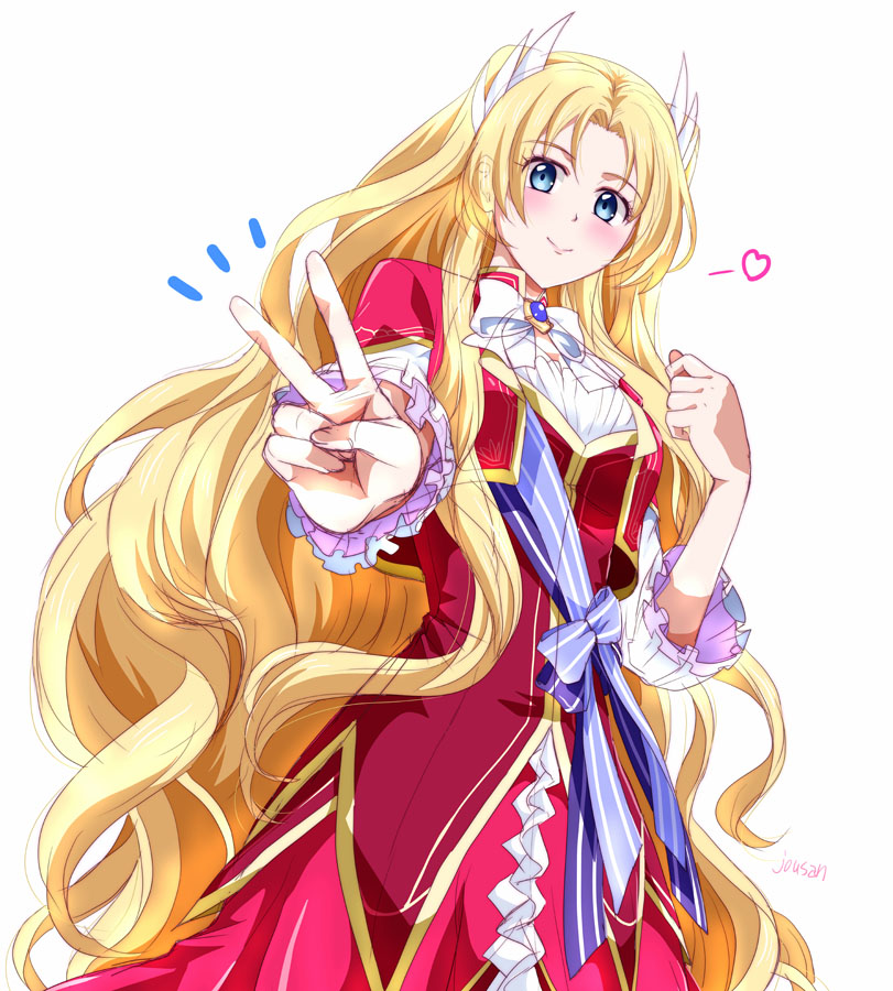 1girl alfin_reise_arnor artist_name blonde_hair blue_eyes breasts brooch dress eiyuu_densetsu heart jewelry large_breasts long_hair looking_at_viewer parted_bangs sash sen_no_kiseki sen_no_kiseki_(series) sen_no_kiseki_iii sideburns simple_background smile solo upper_body v v-neck very_long_hair wavy_hair white_background xiacheng_tatsuya