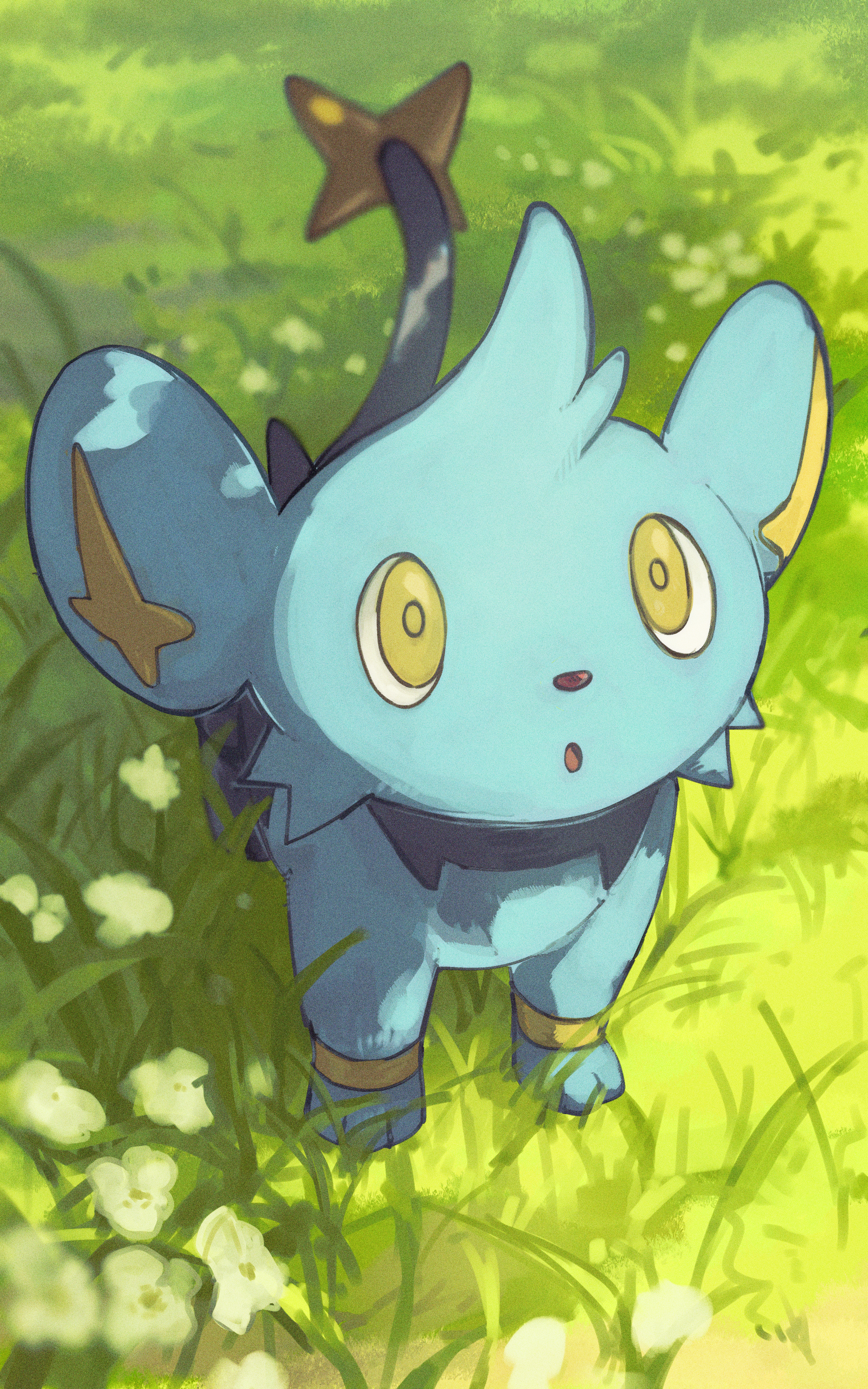 :o absurdres ako_(hoshiya_830) commentary day flower gen_4_pokemon grass highres looking_up nintendo no_humans outdoors pokemon pokemon_(creature) pokemon_focus shinx solo standing yellow_eyes yellow_pupils