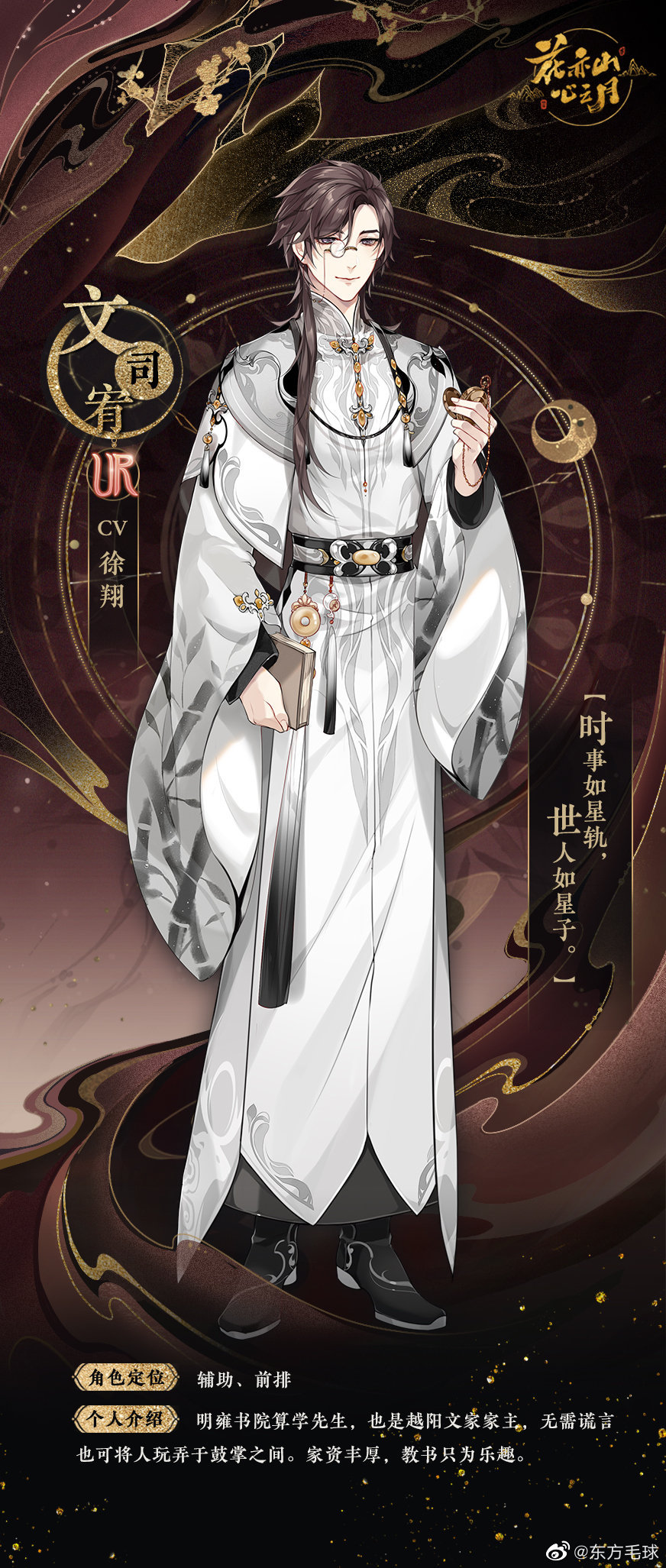 1boy arm_at_side bamboo_print black_boots black_sash book boots brown_hair capelet character_profile chinese_clothes chinese_commentary chinese_text closed_mouth curtained_hair dongfang_mao_qiu full_body gem grey_capelet hand_up hanfu highres holding holding_book holding_pocket_watch hua_yi_shanxin_zhiyue long_hair long_sleeves looking_at_viewer male_focus monocle official_art pocket_watch purple_eyes robe sash smile solo standing swept_bangs tassel watch watermark weibo_watermark wen_siyu white_hanfu white_robe wide_sleeves yaopei yellow_gem