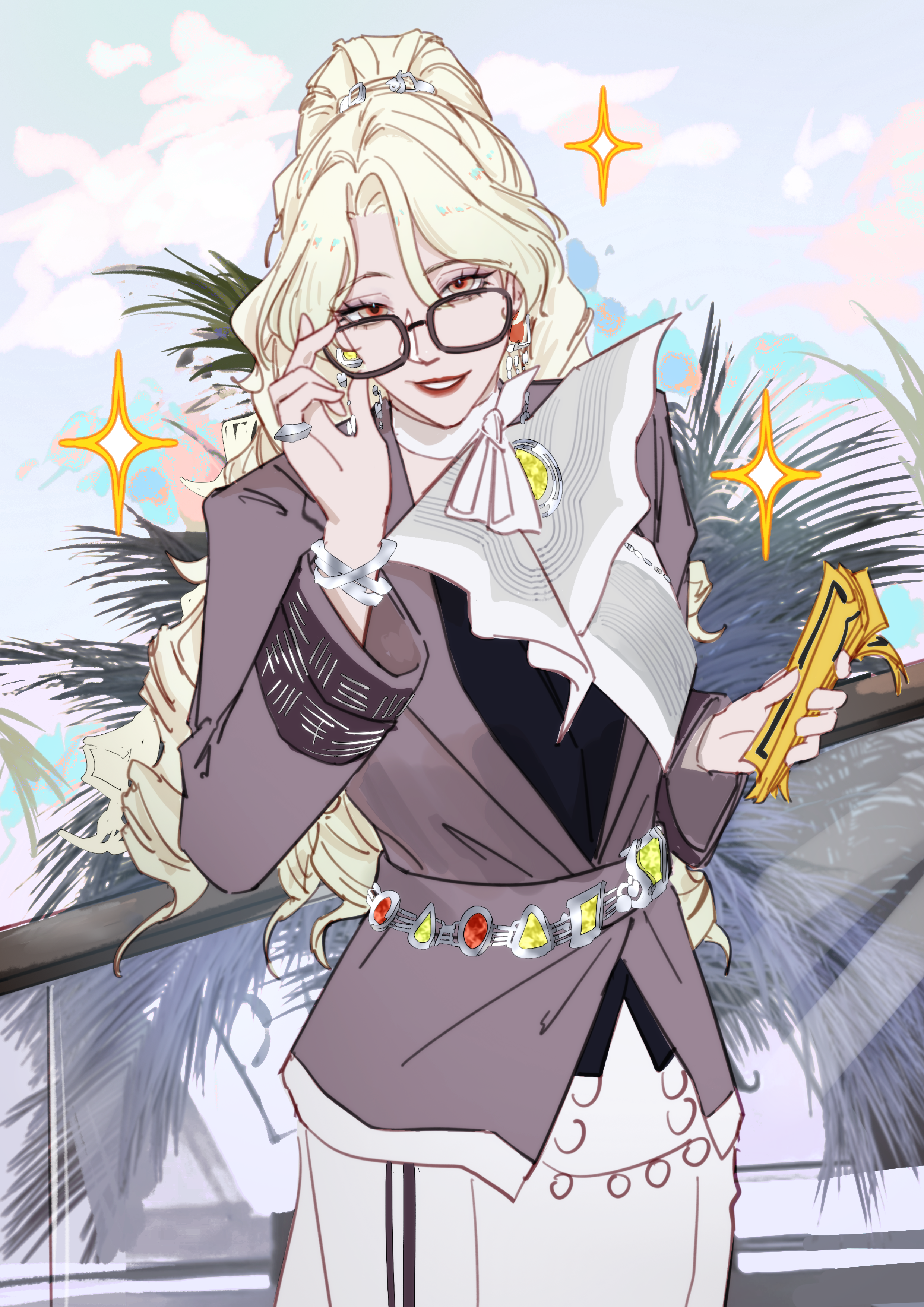 absurdres banknote blonde_hair bracelet cloud cloudy_sky curly_hair earrings glasses highres holding holding_money jewelry linceyang money orange_eyes parfait_(path_to_nowhere) path_to_nowhere ponytail ring sky sparkle tree