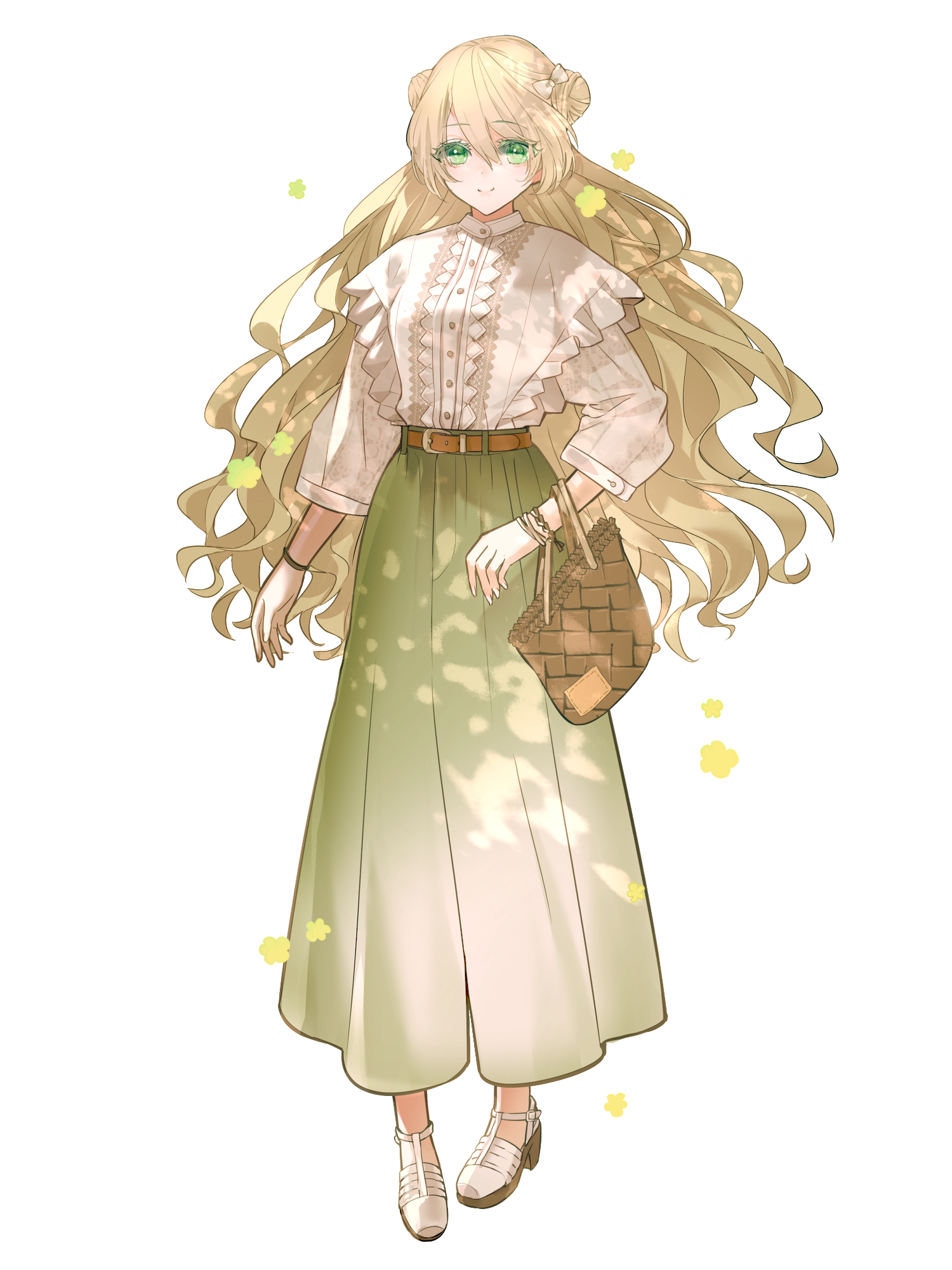 1girl bag blonde_hair bow bracelet breasts chain_paradox frills full_body green_eyes hair_between_eyes hair_bow handbag highres iris_testarossa jewelry looking_at_viewer ribbon sajitara_shiori see-through_clothes see-through_sleeves shirt shoes small_breasts smile solo standing transparent_background white_nails white_shirt white_shoes wristband