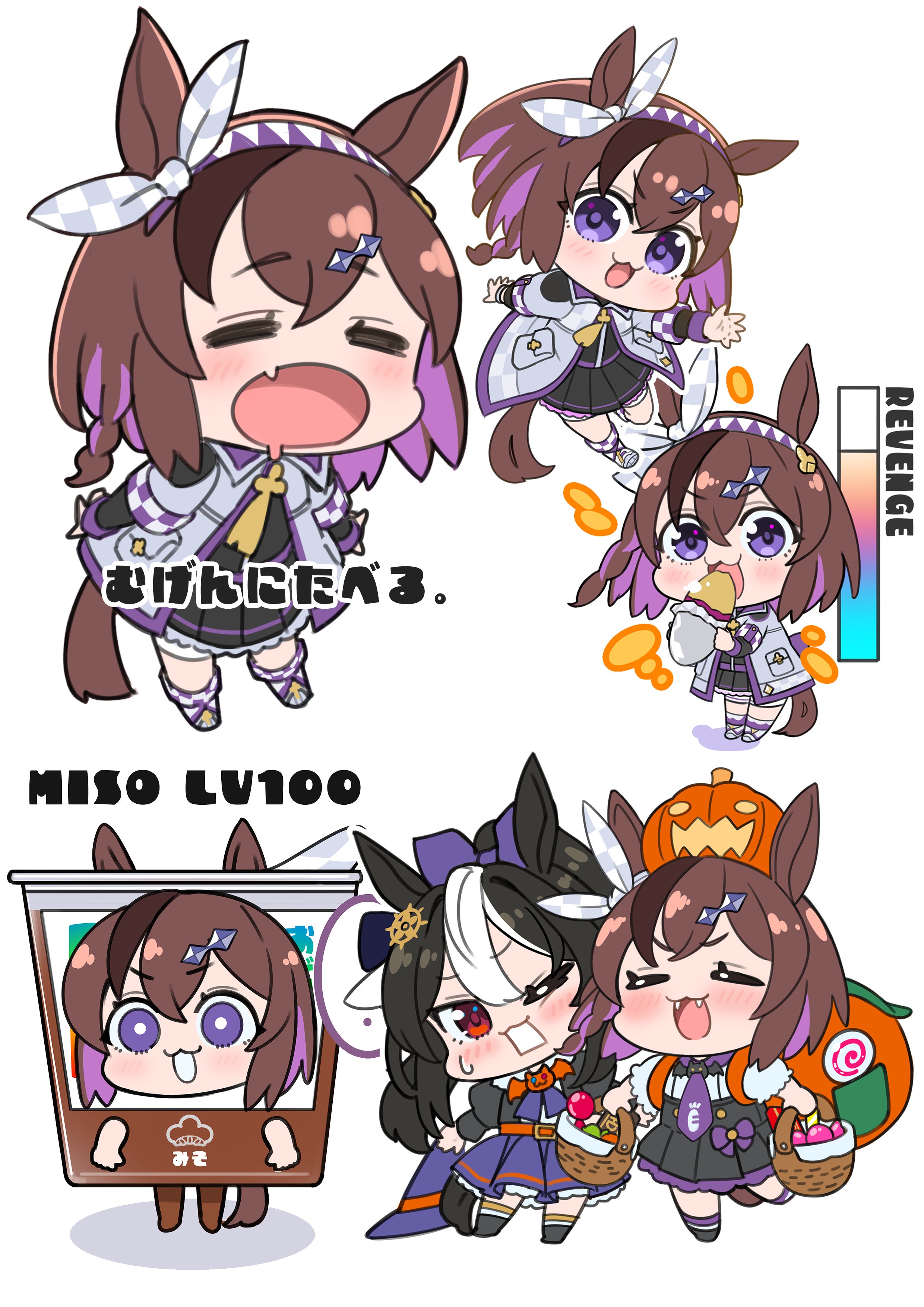 2girls =_= absurdres animal_ears brown_hair chibi do_deuce_(racehorse) equinox_(racehorse) fang food genderswap genderswap_(mtf) hair_between_eyes hair_ornament hairband highres horse_ears horse_girl horse_tail looking_at_viewer multiple_girls original personification purple_eyes red_eyes saliva sweet_potato tail yokoji_(kodai2015)