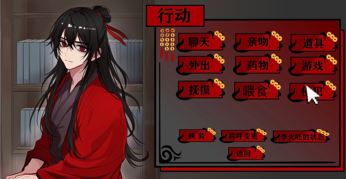 1boy bags_under_eyes black_hair black_hanfu bookshelf chinese_clothes chinese_commentary chinese_text closed_mouth coat coin cursor dao_gui_yi_xian dialogue_options fake_screenshot gameplay_mechanics hair_between_eyes hair_bun hair_ribbon half_updo hanfu holed_coin indoors li_huowang long_hair long_sleeves looking_at_viewer male_focus moxiaobingbuxiao red_coat red_eyes red_ribbon ribbon robe single_hair_bun sitting solo upper_body