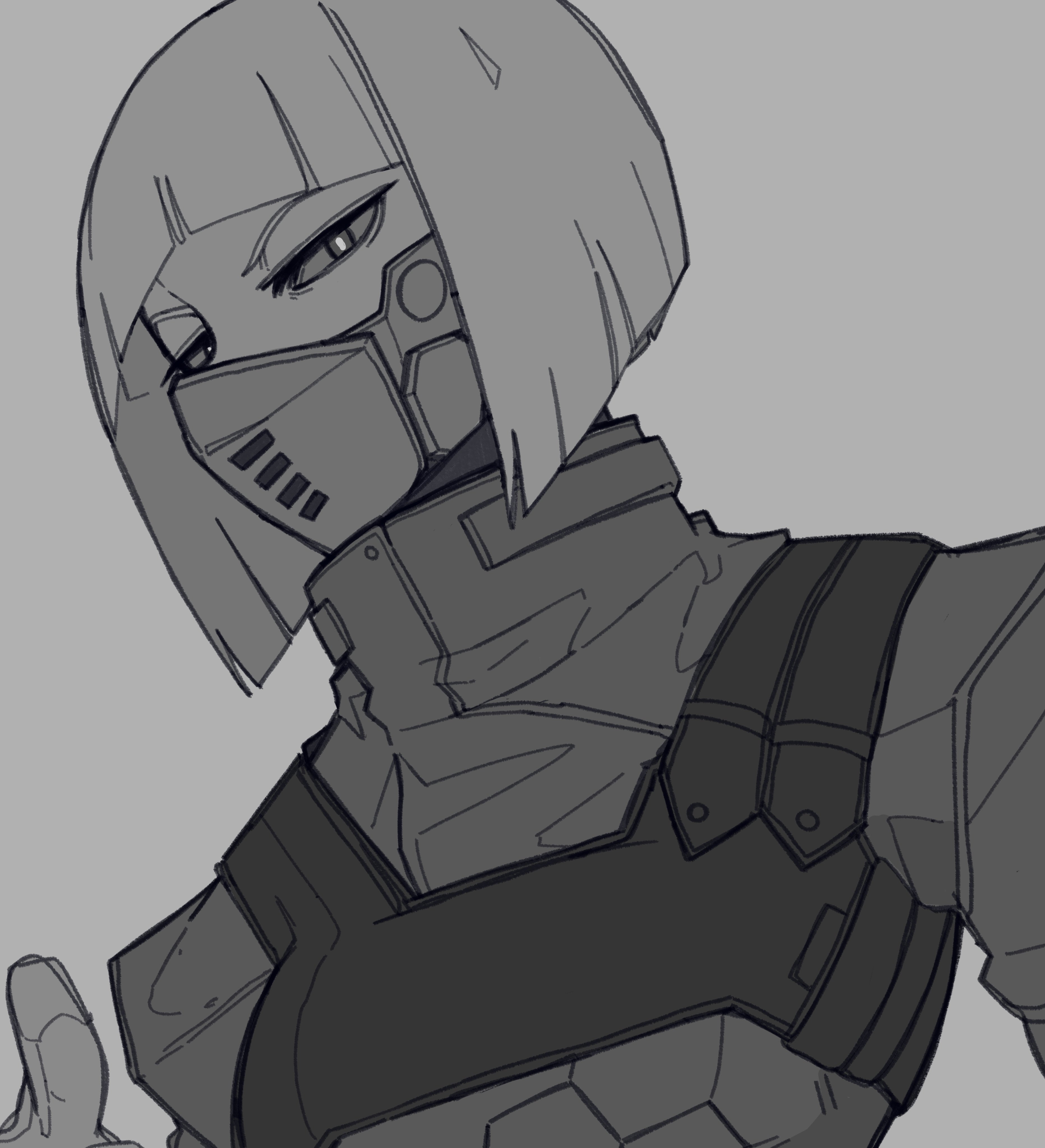 1girl absurdres blunt_bangs blunt_ends bone_nigi cyberpunk_(series) cyborg greyscale highres kiwi_(cyberpunk) looking_at_viewer mask monochrome mouth_mask short_hair solo